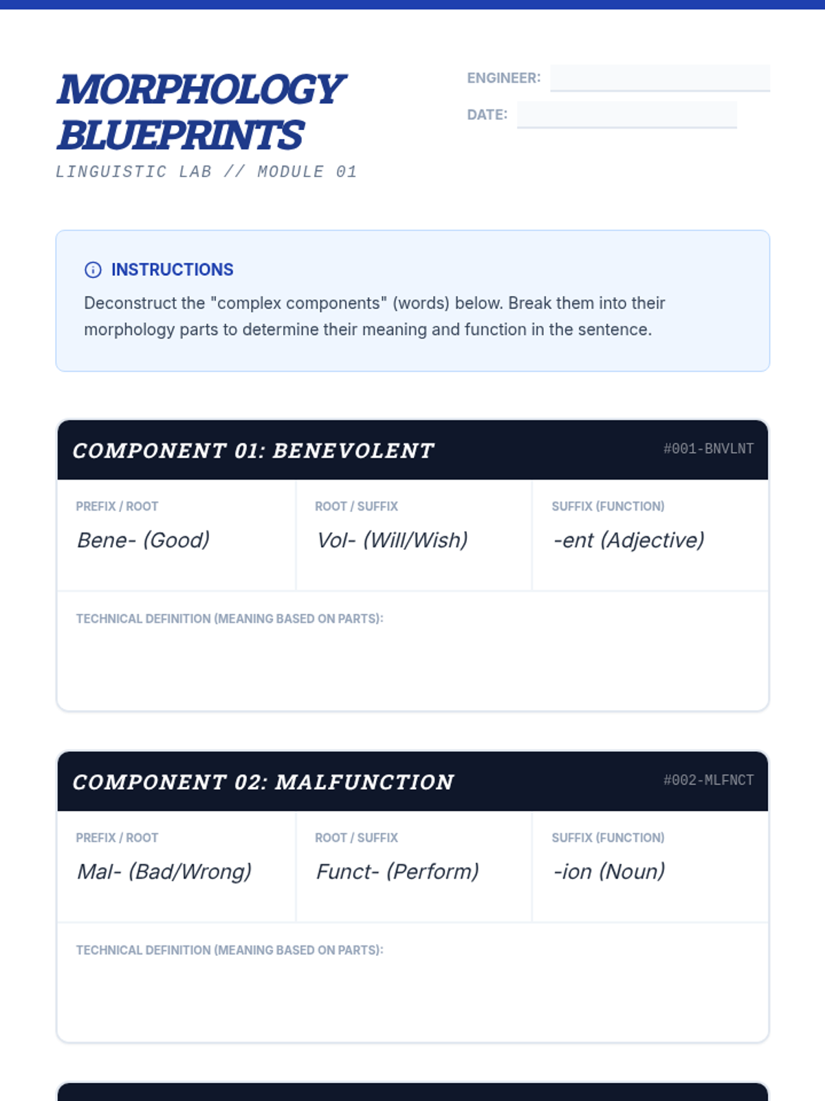 A 3-page student worksheet titled 'Morphology Blueprints'. It includes a graphic organizer for deconstructing word parts (prefix, root, suffix), practice questions using context clues, and a section on word relationships (synonyms, antonyms, part/whole) using a mechanical theme.