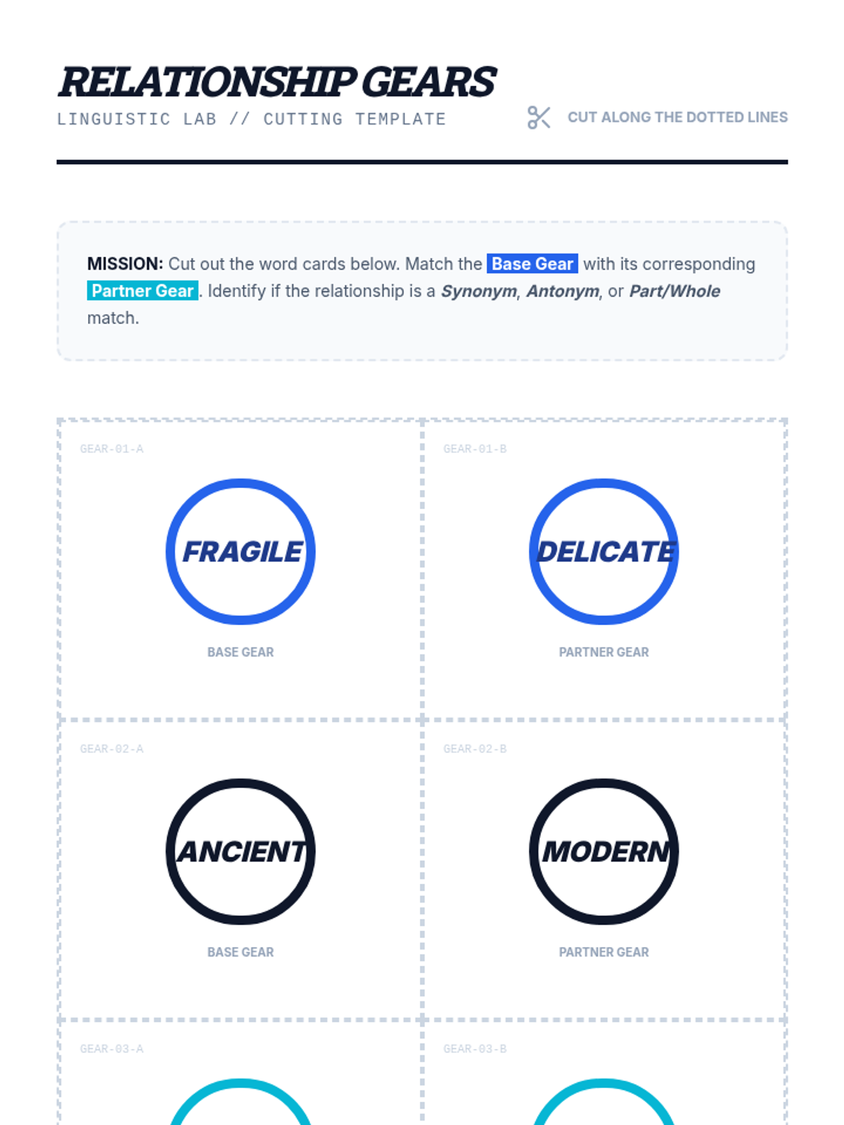 A printable page of 12 matching 'gear' cards for a vocabulary activity. Students cut out the cards and match words based on relationships like synonyms, antonyms, and part/whole pairs. Designed with a mechanical, laboratory aesthetic.