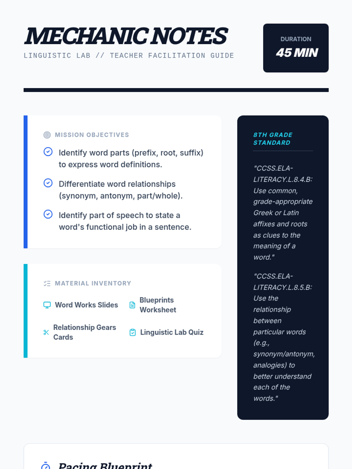 A comprehensive teacher guide for the 'Word Works' lesson. Includes a 45-minute pacing guide, objective alignment with standards, discussion prompts, material inventory, and full answer keys for the worksheet and quiz.