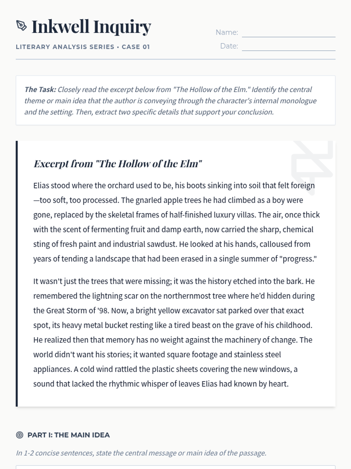 A literary analysis worksheet featuring a short story excerpt about urban development and lost memory, with dedicated workspace for students to identify the main idea and provide supporting evidence.