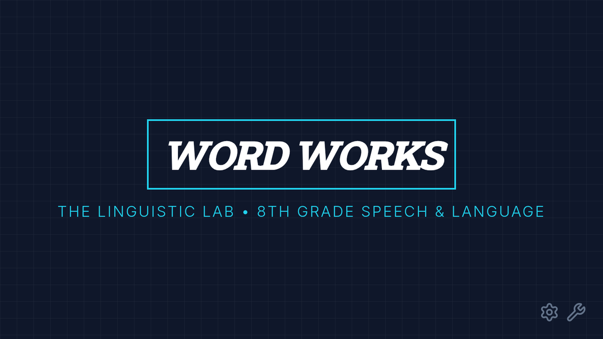 A 6-slide visual presentation for an 8th-grade speech and language lesson titled 'Word Works'. It covers morphology (prefixes, roots, suffixes), word relationships (synonyms, antonyms, part/whole), and parts of speech using a mechanical/blueprint theme.