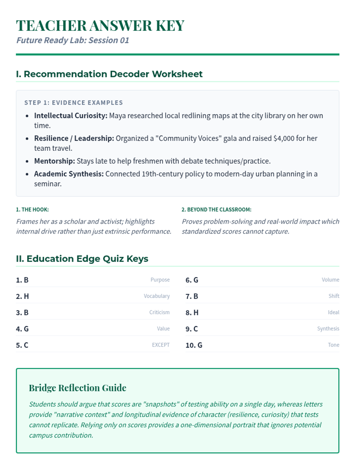 The teacher's answer key for the recommendation letter analysis and the ACT reading quiz, including sample student responses for critical thinking questions.
