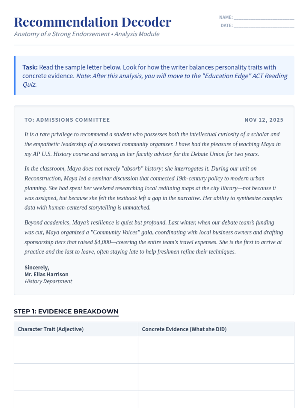 A step-by-step worksheet guiding 11th graders through the analysis of a sample recommendation letter, focusing on identifying traits and evidence.