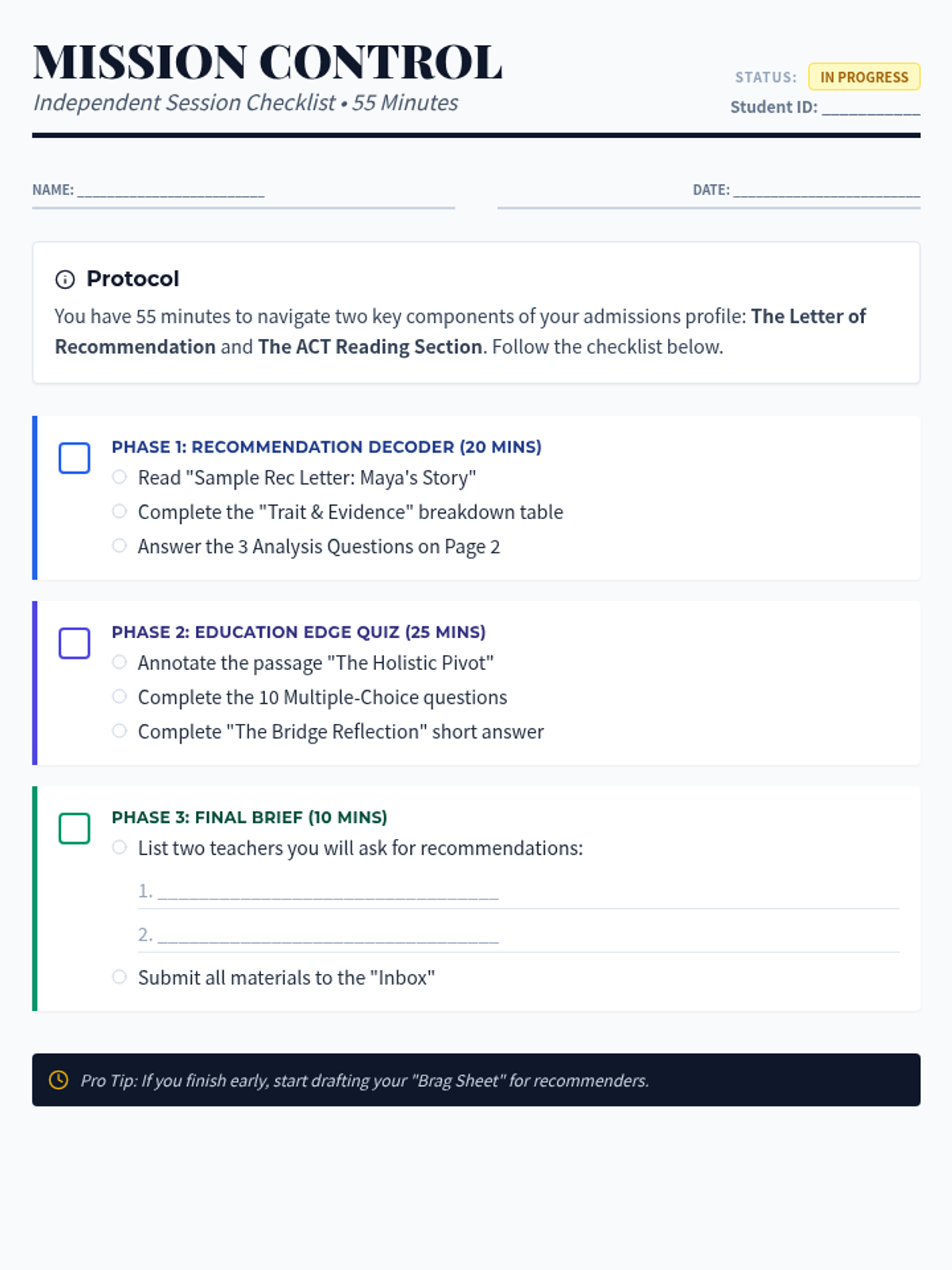 A self-paced checklist for an 11th-grade lesson, guiding students through a recommendation letter analysis and an ACT-style reading quiz.