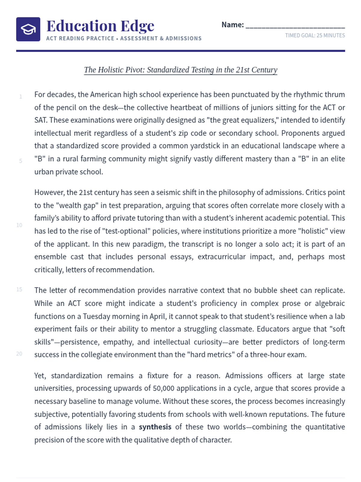 An ACT-style reading passage and 10-question quiz about the evolution of standardized testing and the role of recommendation letters in admissions.