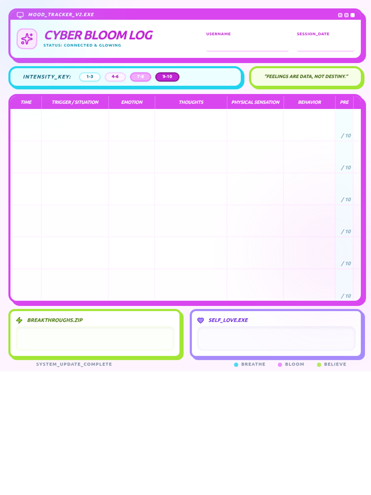A vibrant Y2K-themed emotion tracking log presented as a comprehensive single-page table. Features neon colors, retro-tech UI elements, and a 9-column layout for detailed daily check-ins. Optimized for single-page printing.