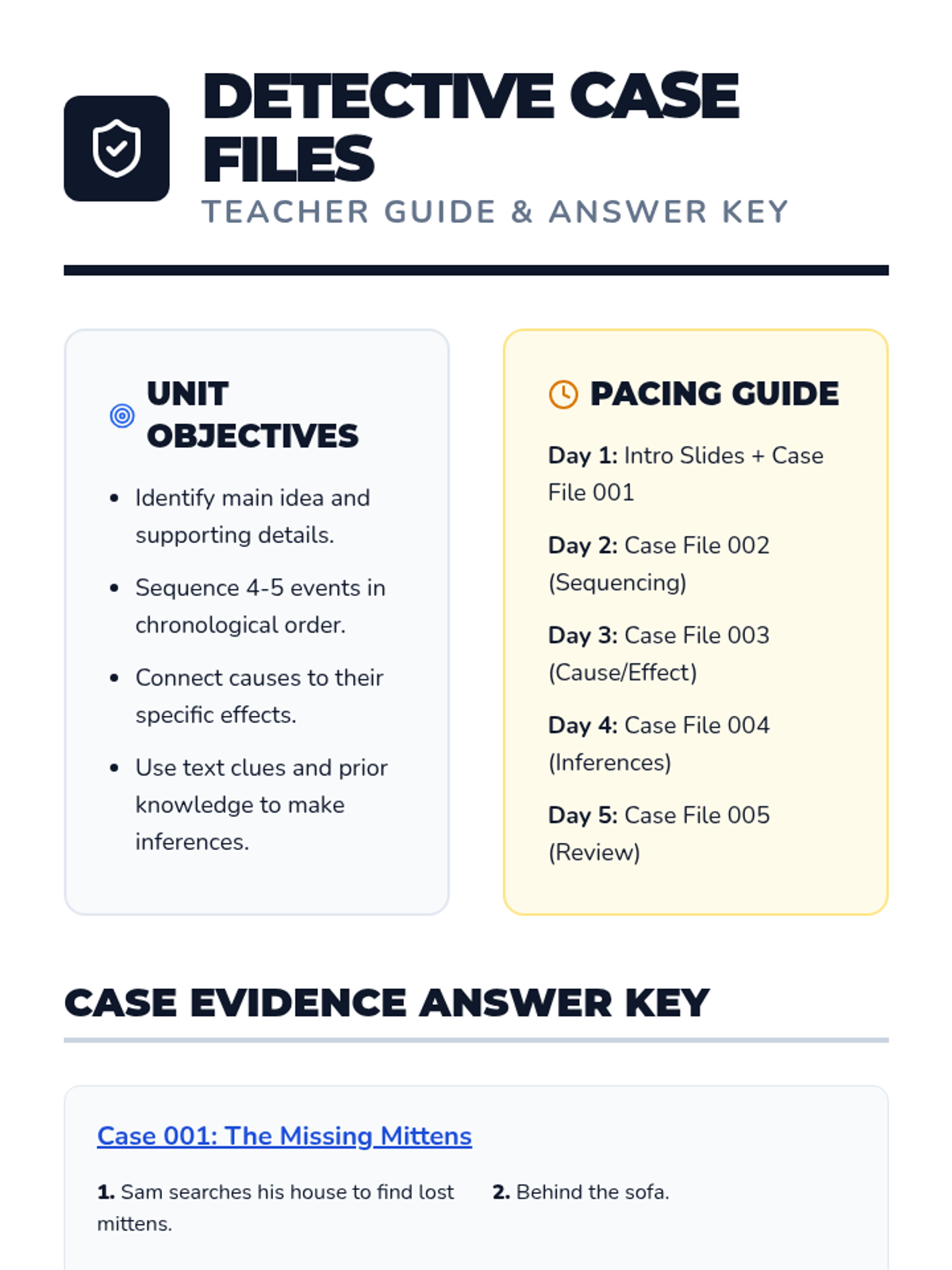 A teacher guide and answer key for the Reading Detectives unit, including pacing suggestions, unit objectives, and full answer keys for all five stories.