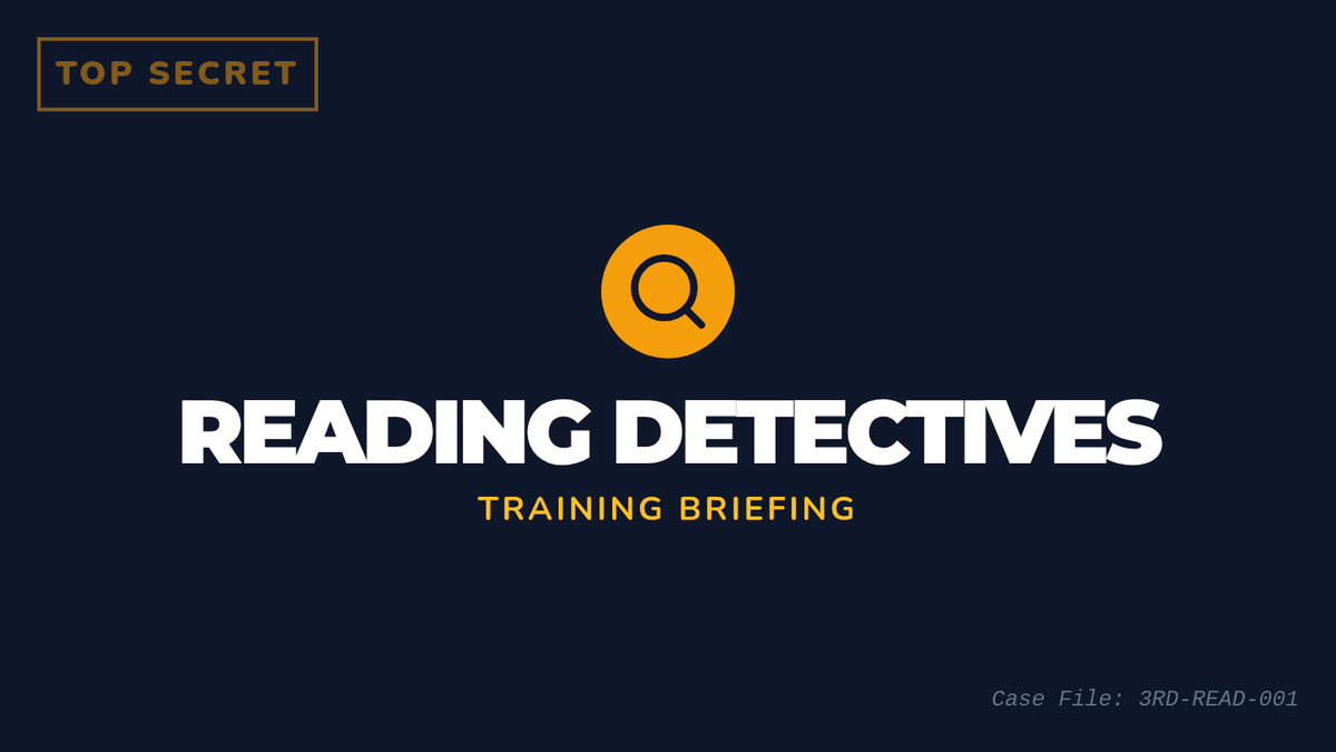 A slide deck introducing 3rd-grade reading comprehension skills using a detective theme, covering main idea, sequencing, cause and effect, and making inferences.