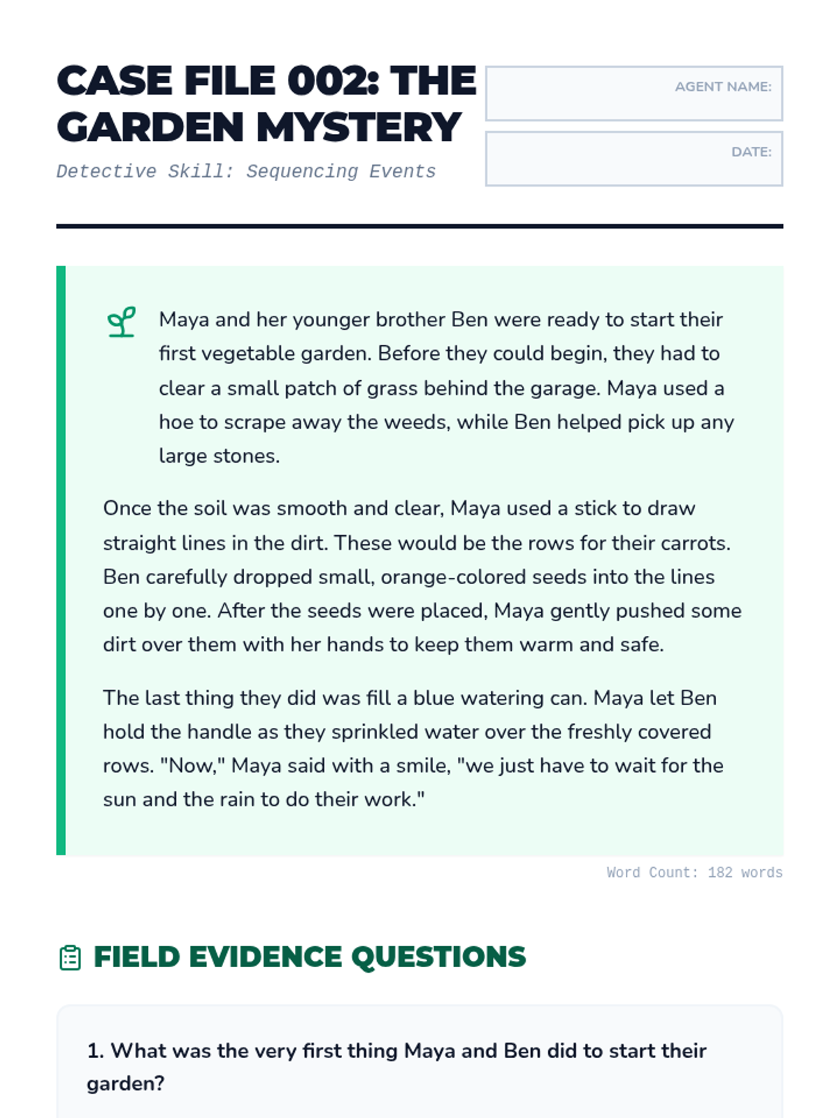 A 3rd-grade reading comprehension worksheet focused on sequencing events through a story about planting a garden.