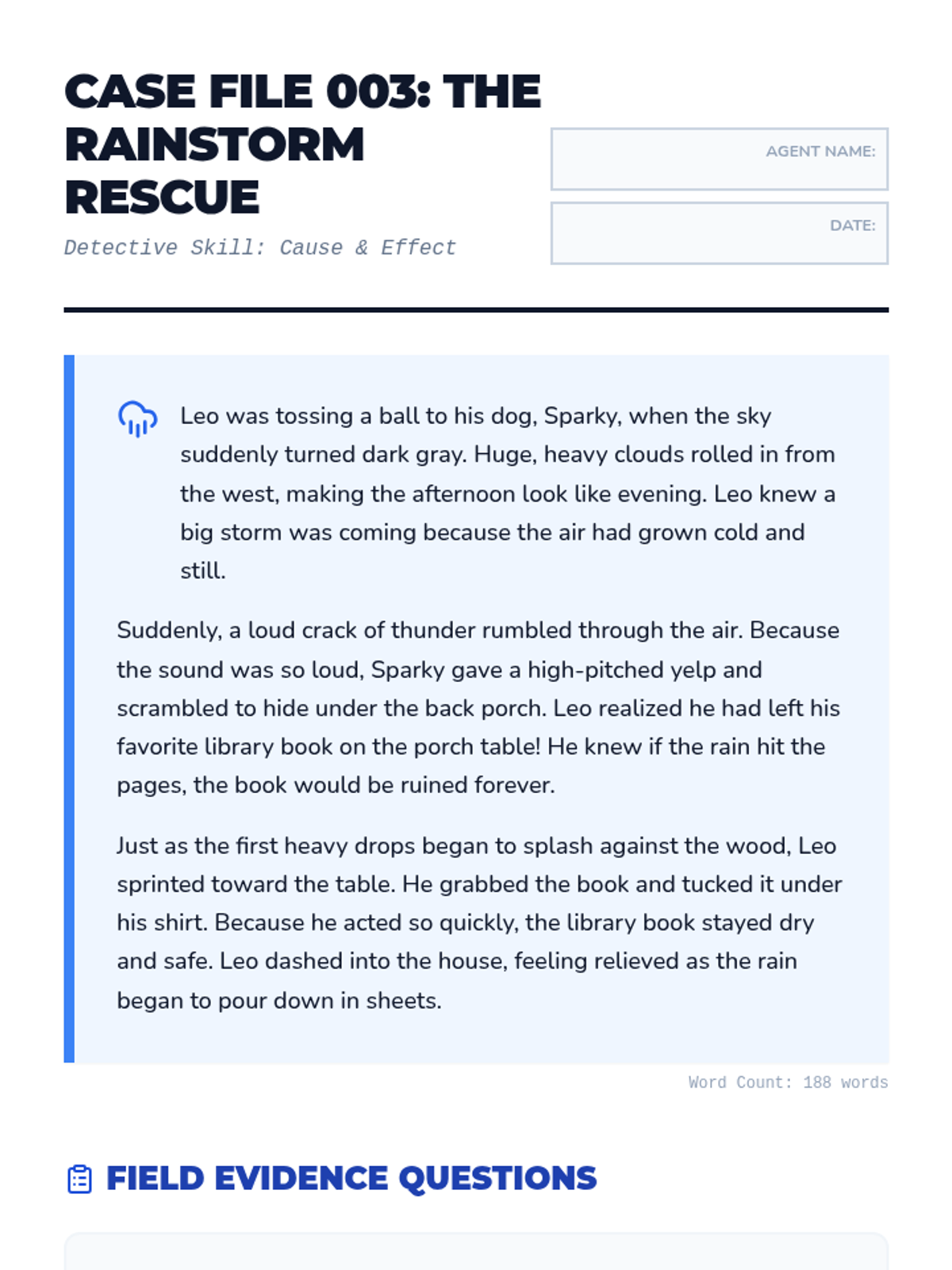 A 3rd-grade reading comprehension worksheet focused on cause and effect through a story about a rainstorm rescue.