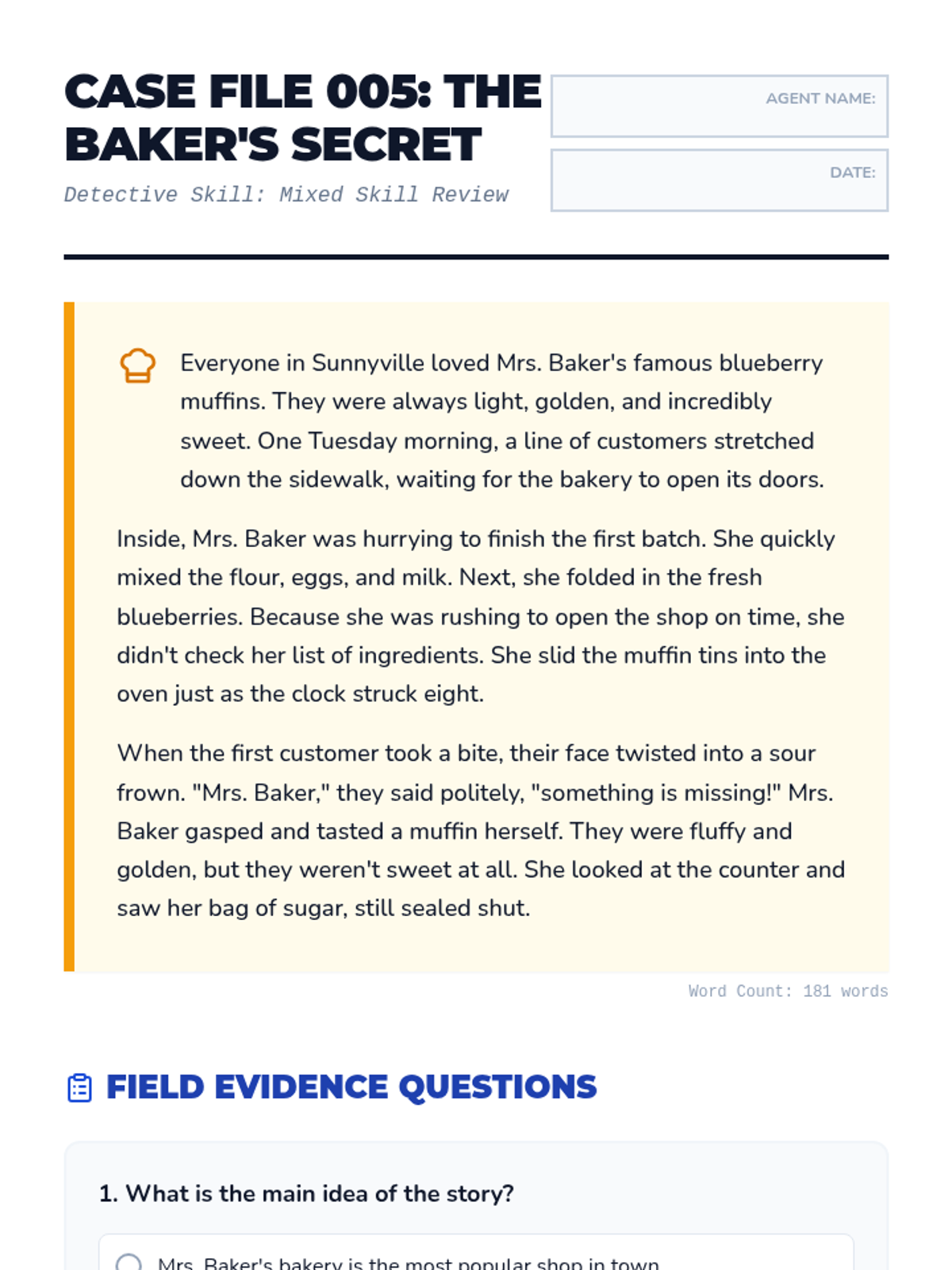 A 3rd-grade reading comprehension worksheet focused on mixed skills review through a story about a baker's mistake.