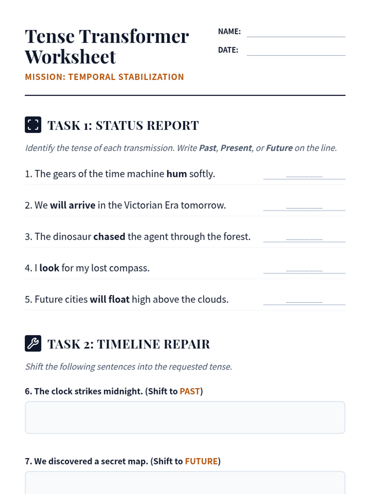 A time-travel themed student worksheet featuring verb tense identification, sentence transformation, and a paragraph-completion activity.
