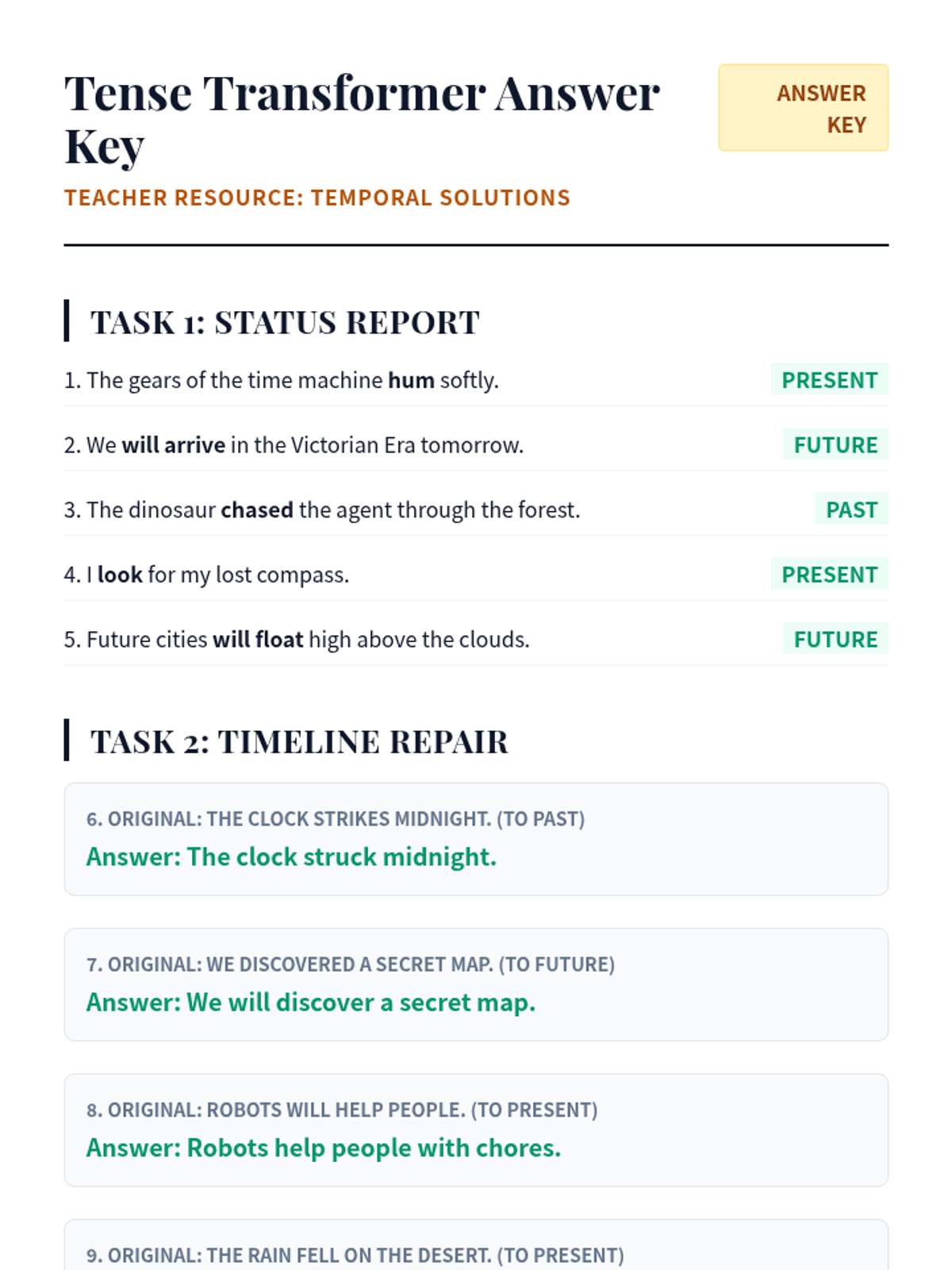 A teacher's answer key for the Tense Transformer Worksheet, including correct identifications, shifted sentences, and completed log entry.