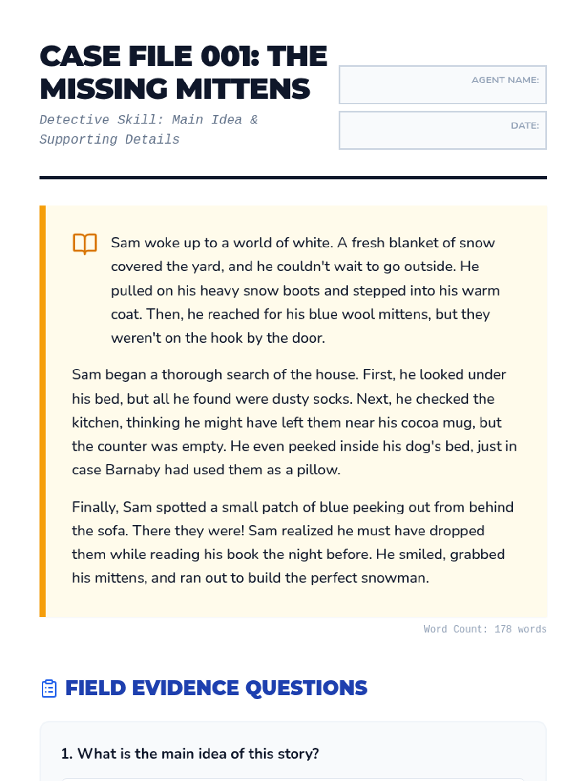 A 3rd-grade reading comprehension worksheet focused on main idea and supporting details through a short story about lost mittens.