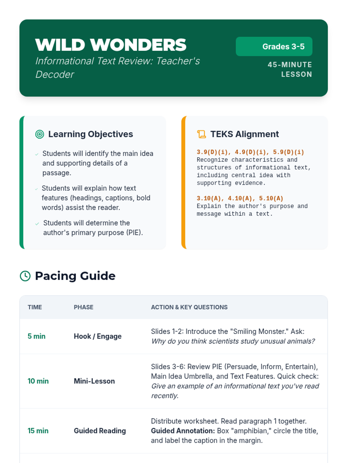 A teacher facilitation guide including lesson pacing, TEKS alignment, an answer key with rationales, and differentiation strategies.