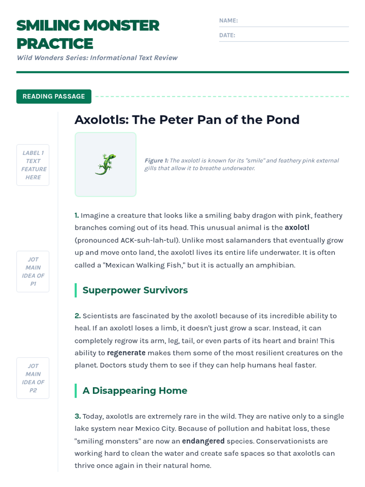 A student practice worksheet featuring an informational text about axolotls with annotation margins, STAAR-formatted multiple-choice questions, and a short constructed response area.