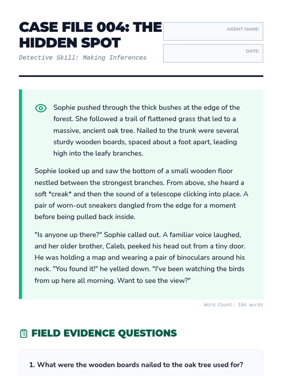 A 3rd-grade reading comprehension worksheet focused on making inferences through a story about a hidden treehouse.