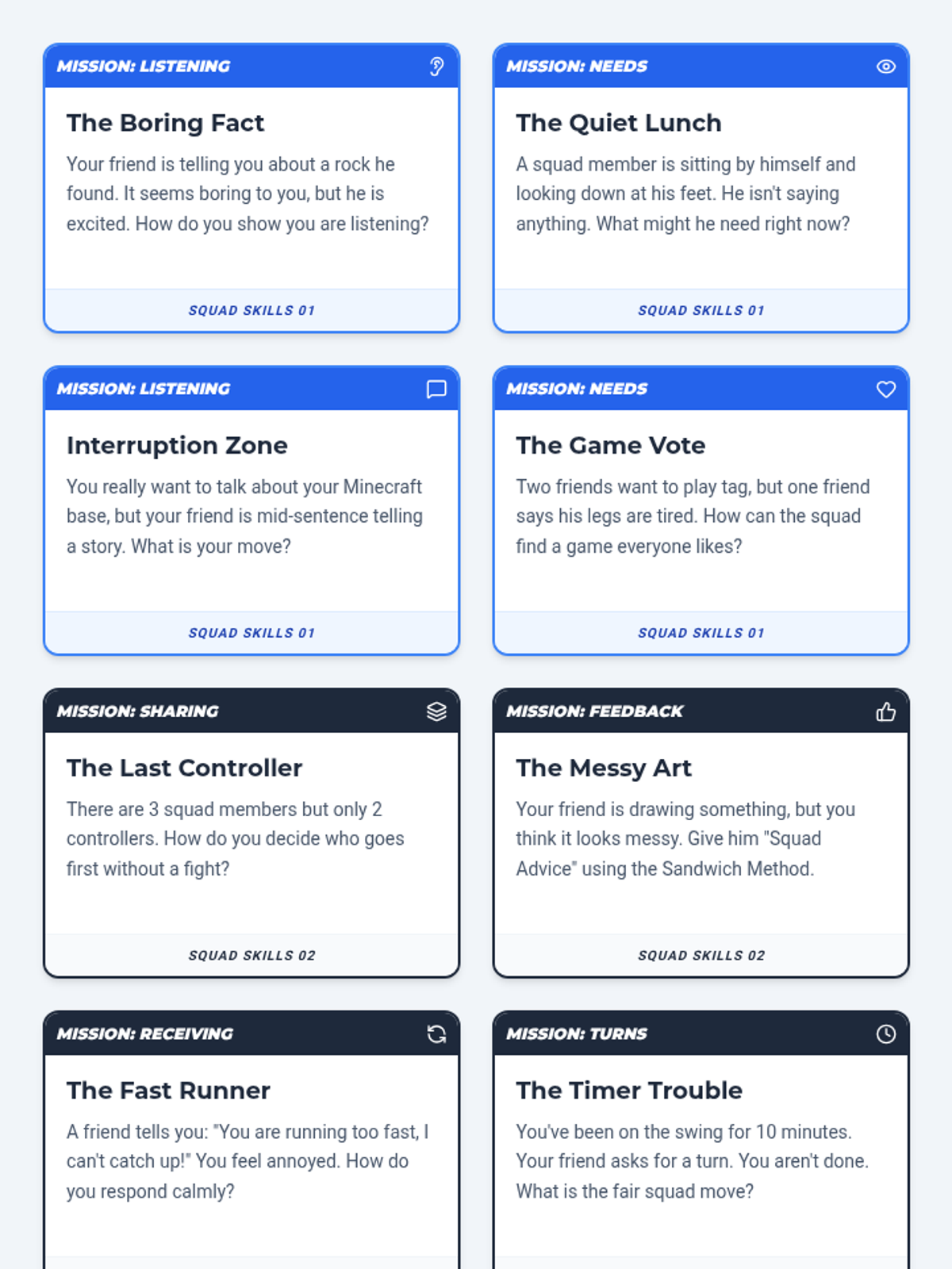 A set of 16 'Mission Briefing' scenario cards for role-playing social situations. Divided into four categories: Listening, Sharing/Feedback, Conflict Resolution, and Inclusion/Celebration. Designed for a group of 3 boys to practice real-world social skills.