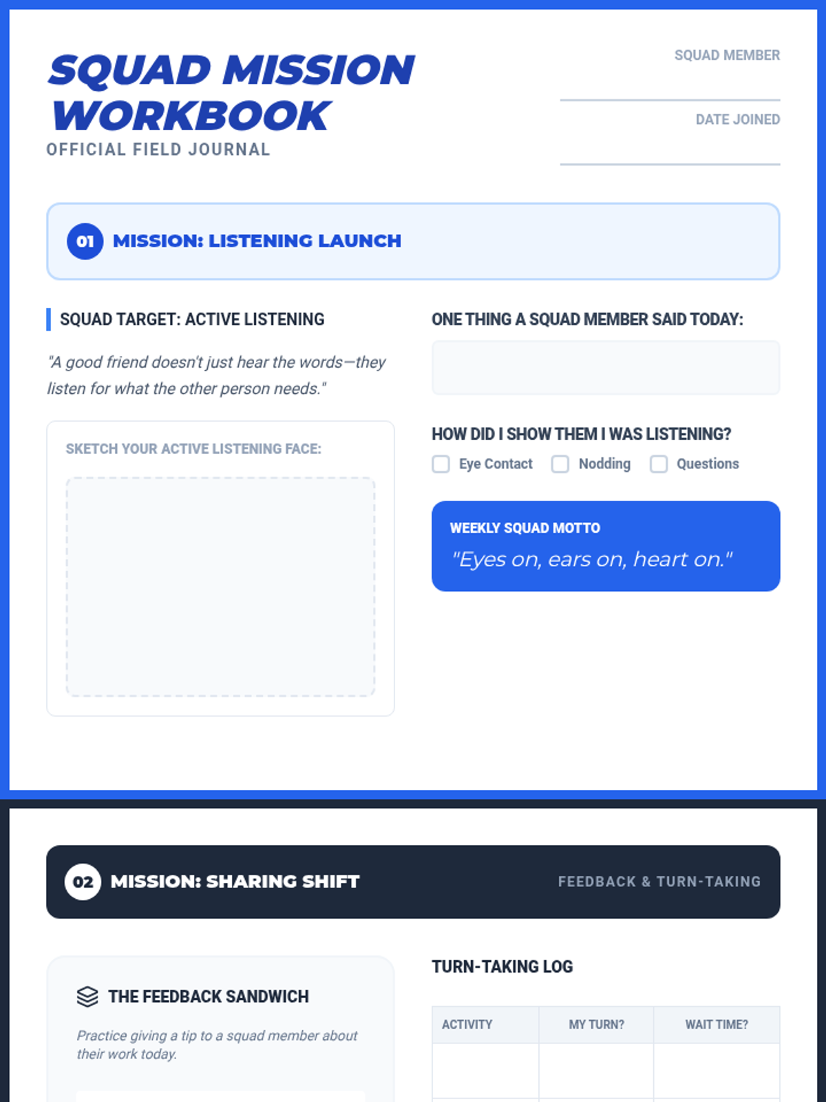 A 4-page student workbook for the 'Squad Skills' program. Includes self-reflection activities, a feedback sandwich practice area, conflict resolution planning, and a graduation oath. Designed for printing and handwriting.