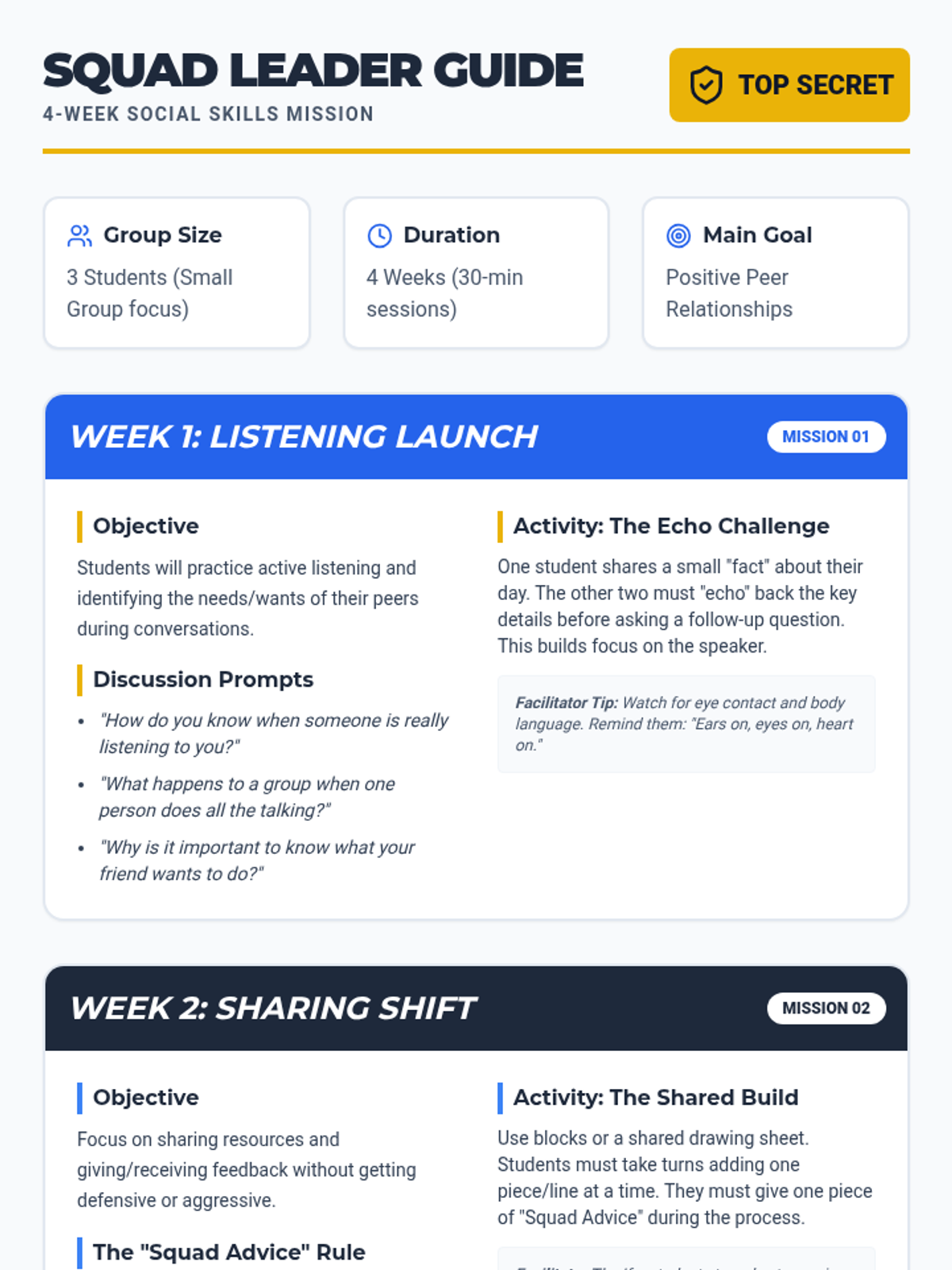 A comprehensive 4-week facilitation guide for educators working with a small group of boys on social skills. Includes weekly objectives, discussion prompts, activities, and facilitator tips focusing on listening, sharing, conflict resolution, and group celebration.