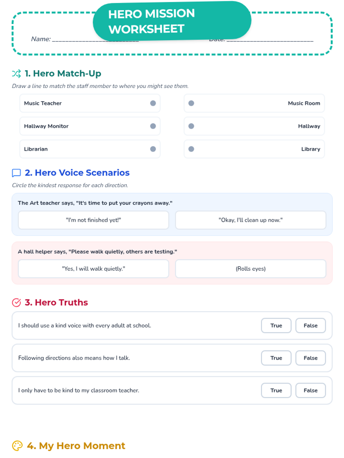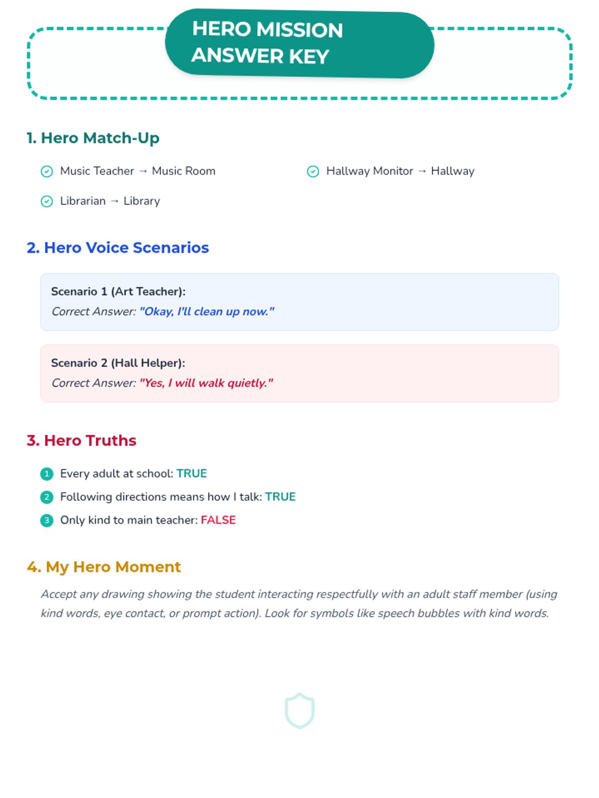 A student-facing anchor chart and social story that uses "Kind Voice Hero" imagery to teach respect for all school staff. It highlights that kind communication is a key part of following directions.