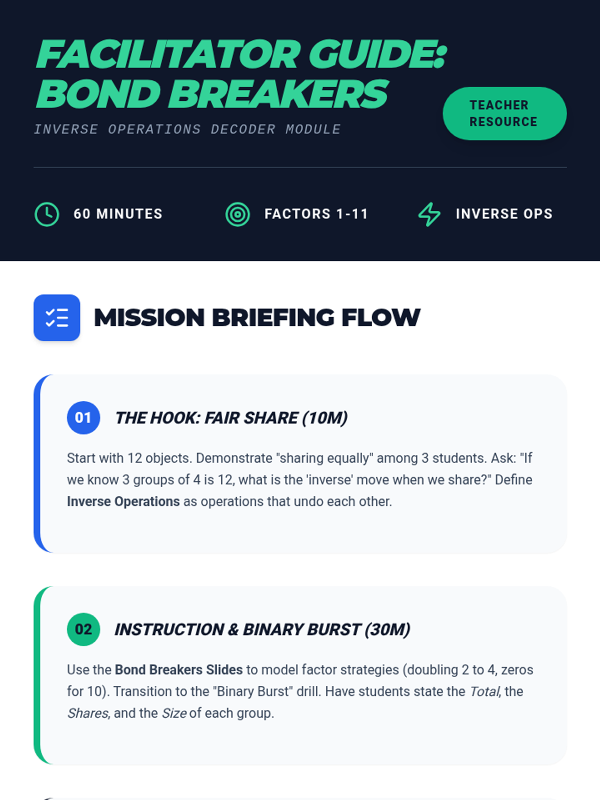 A one-page facilitation guide for teachers including pacing, key instructional points, differentiation strategies, and debrief questions.