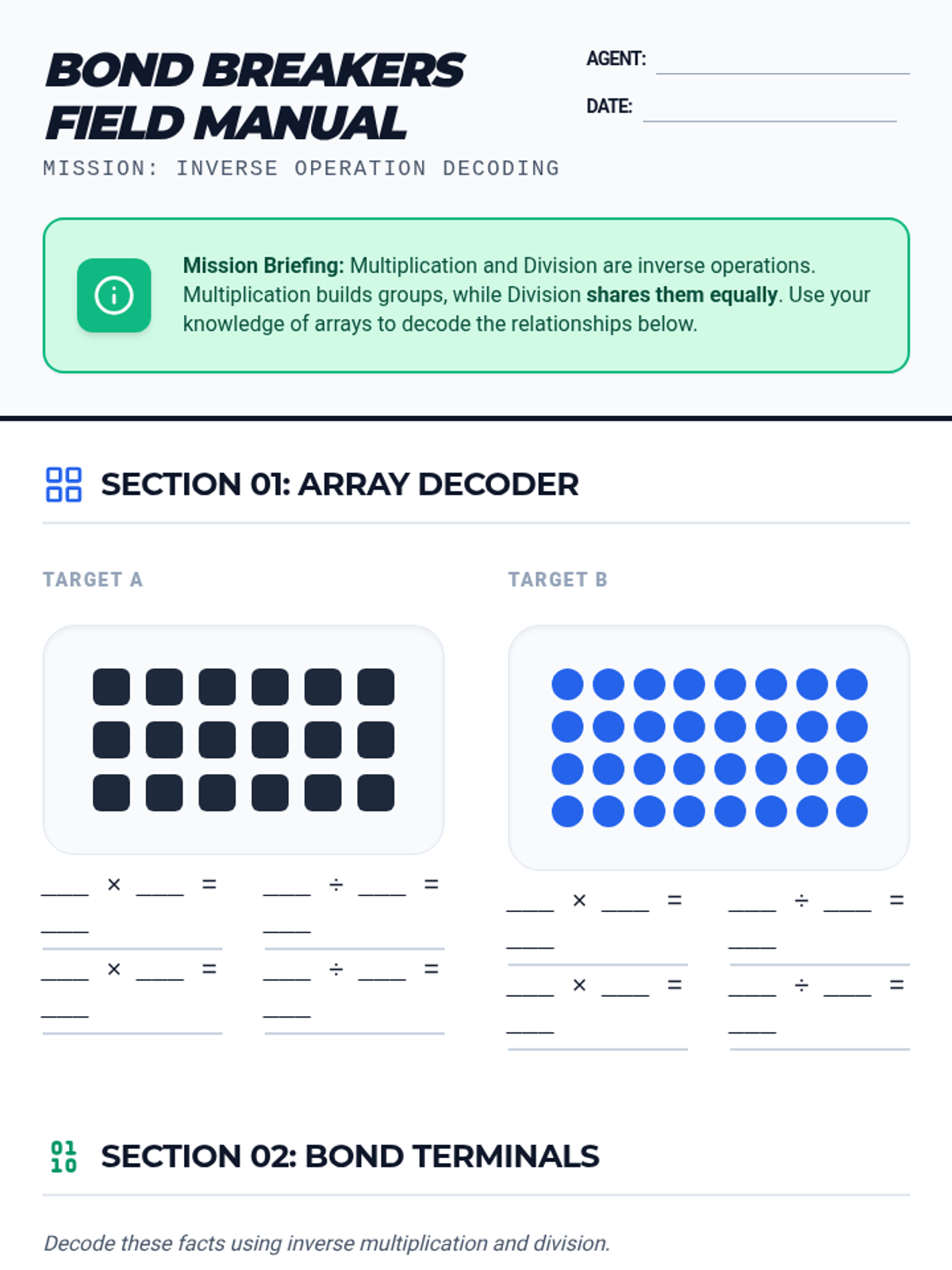 An updated student worksheet with a "Field Manual" theme, emphasizing "sharing equally" in the mission briefing and word problems to strengthen the conceptual link between multiplication and division.