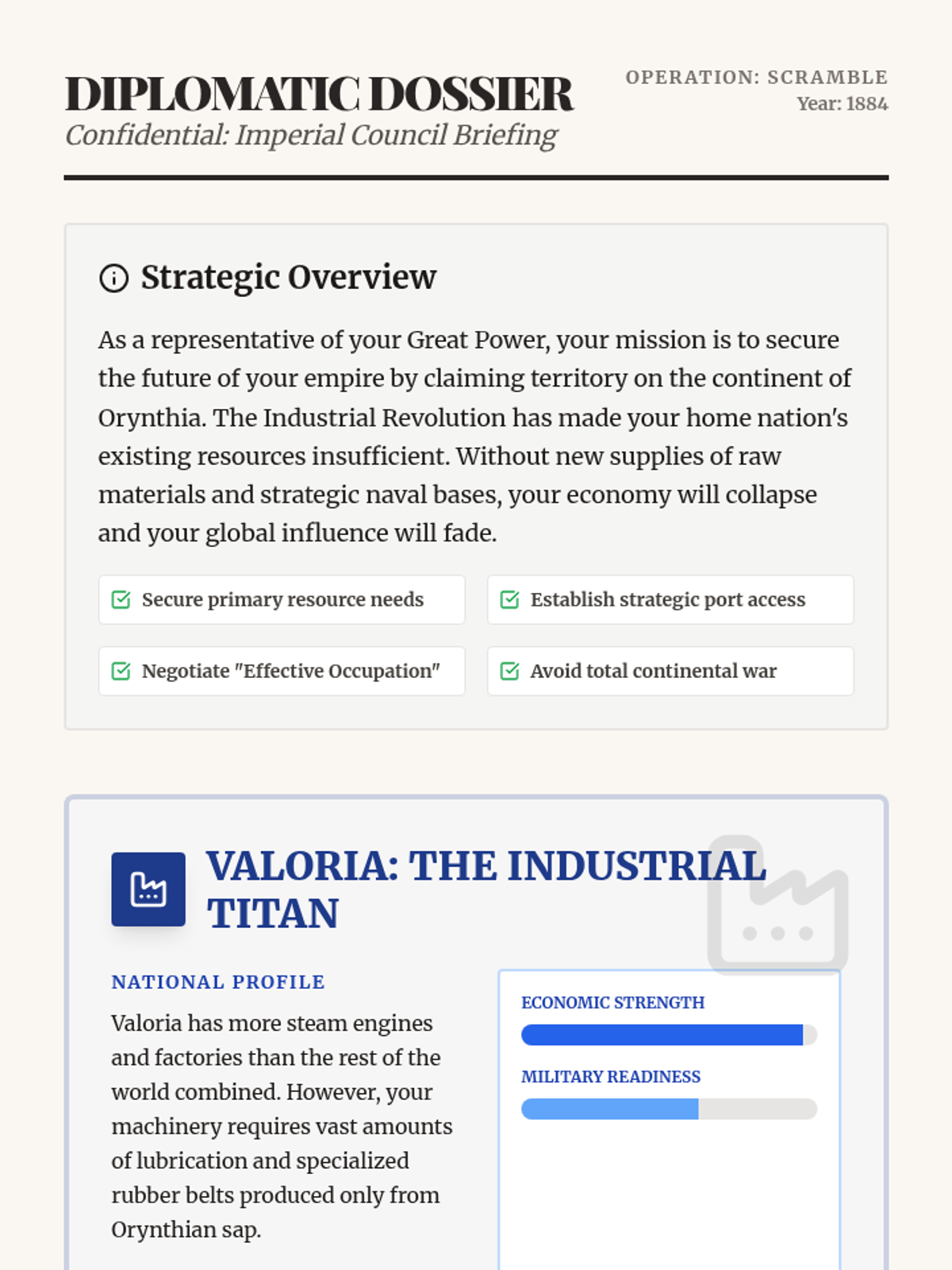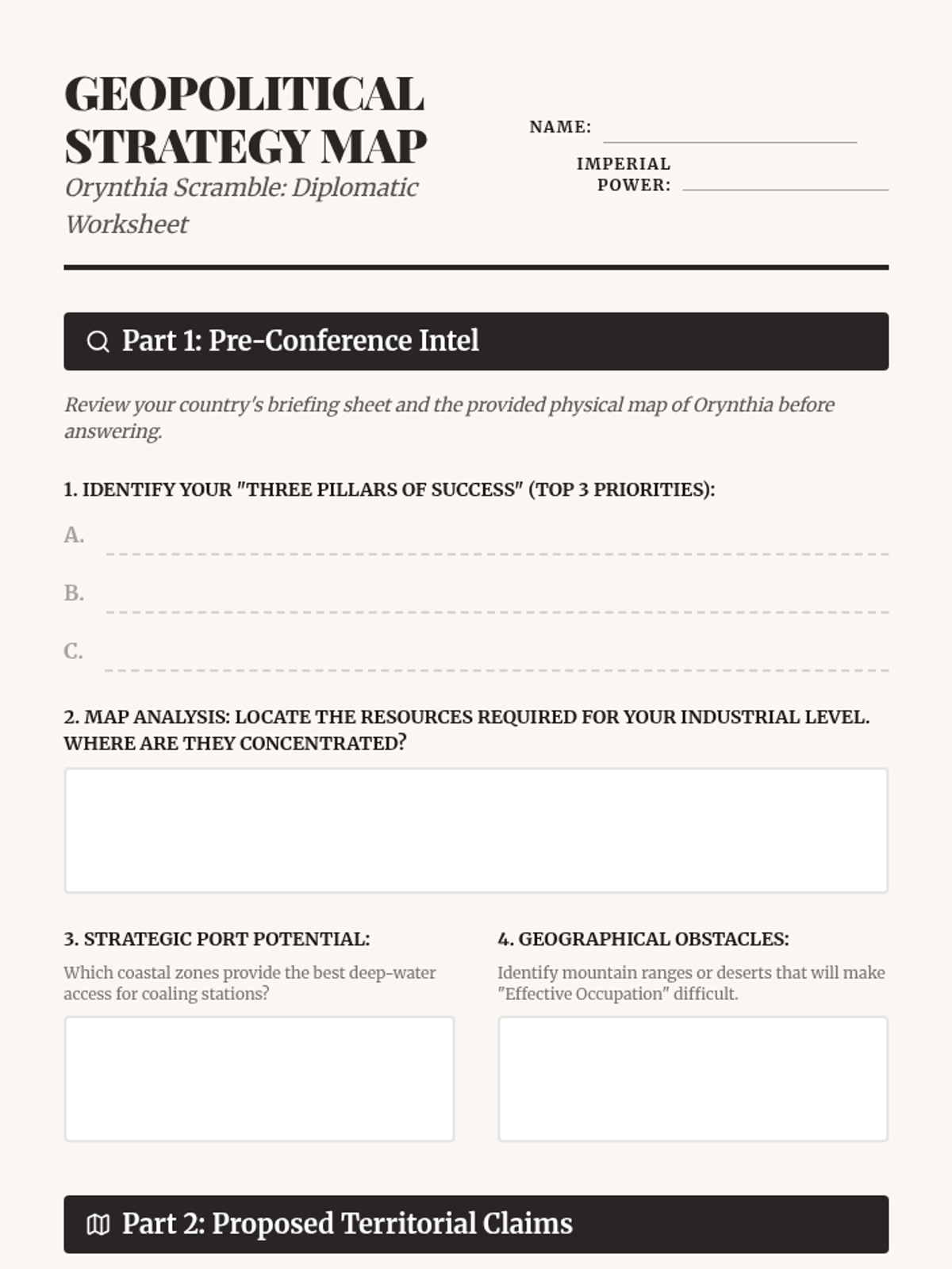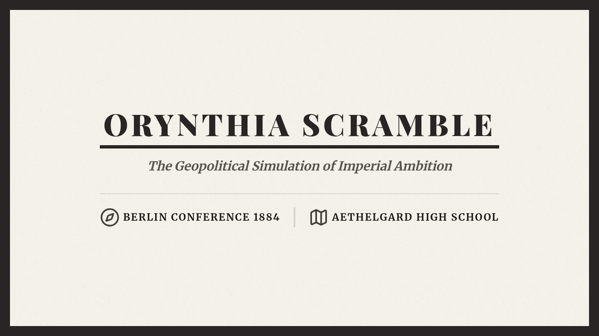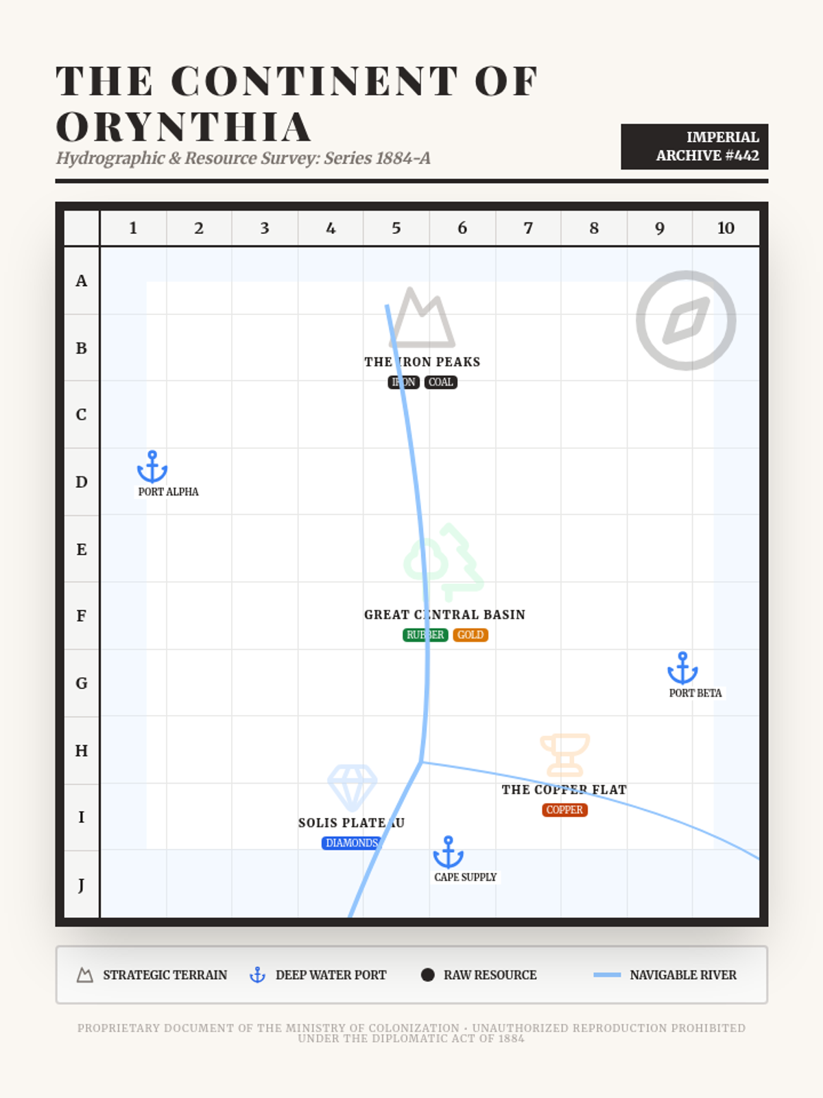 A realistic, vintage-styled cartographic map of the fictional continent of Orynthia. Features organic landforms, stylized mountains, rainforest regions, river systems, and strategic port locations, all overlaid with a coordinate grid (A-J, 1-10) for simulation playability.