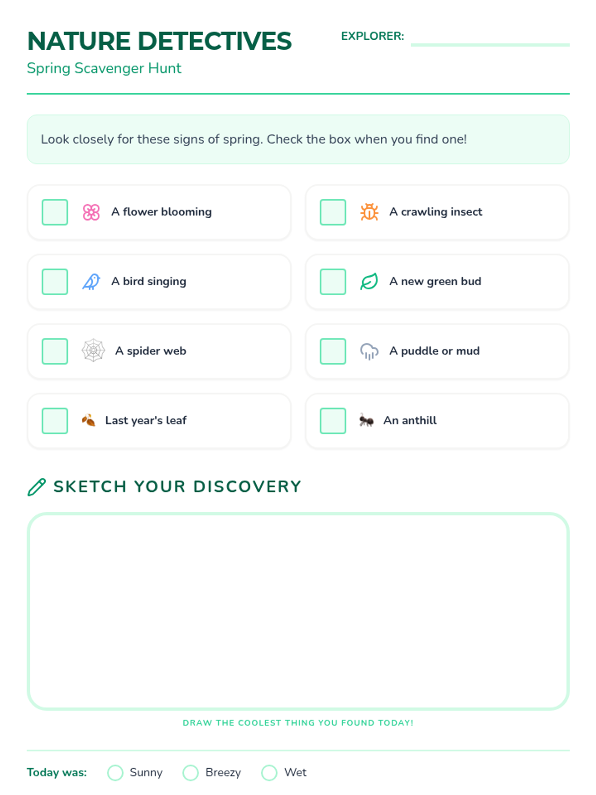An outdoor scavenger hunt checklist for 2nd graders to observe signs of spring, including a sketching area for a field discovery.