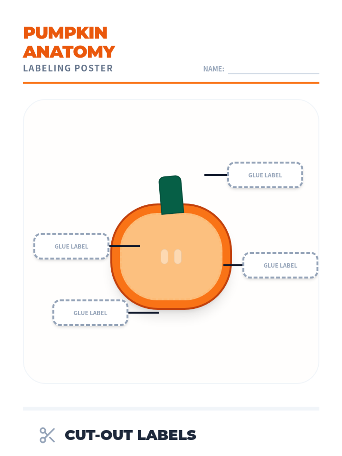 A cut-and-paste poster for labeling the parts of a pumpkin. Includes a poster template with clear visual anchors and a cutout section with labels and simple definitions.