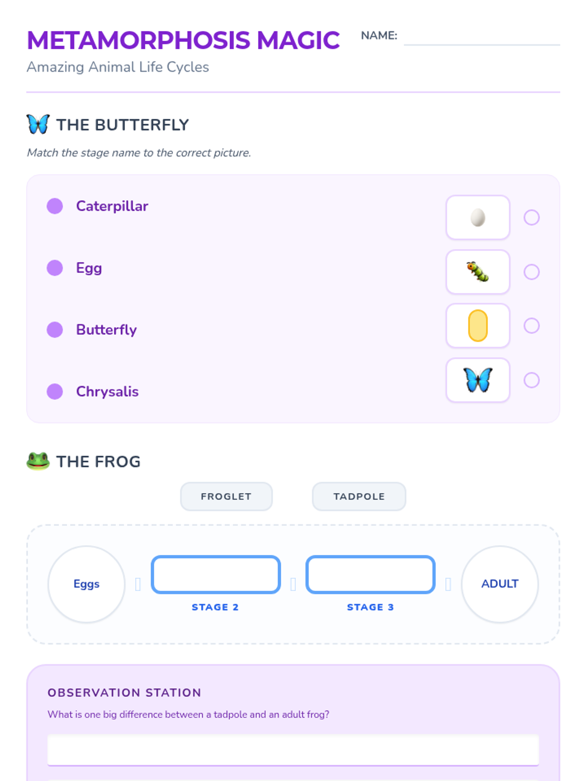 A matching and fill-in-the-blank activity exploring the life cycles of butterflies and frogs, focused on metamorphosis.