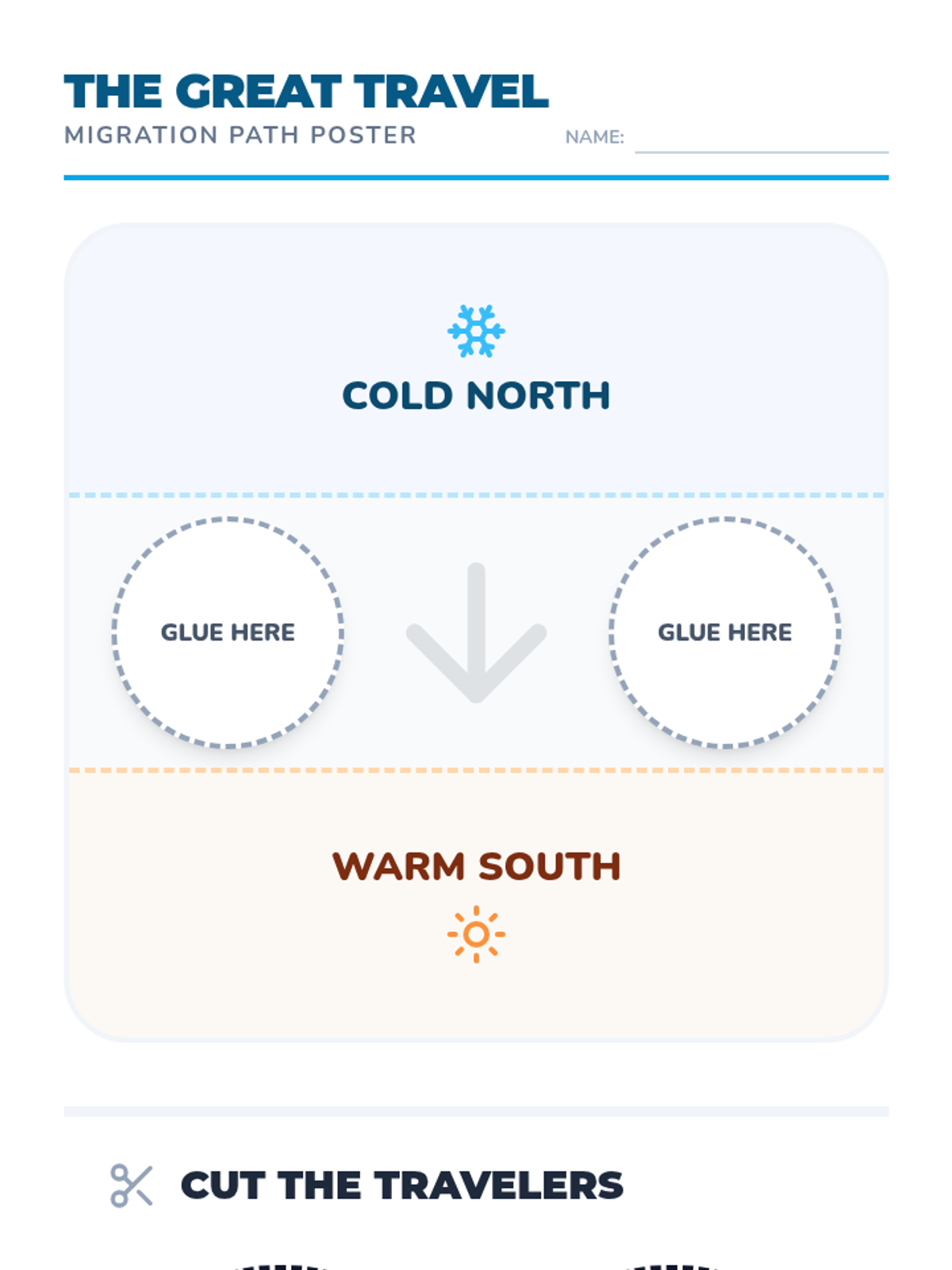 A cut-and-paste poster activity for students to visualize migration paths from north to south. Includes animal cutouts with brief, easy-to-read facts.