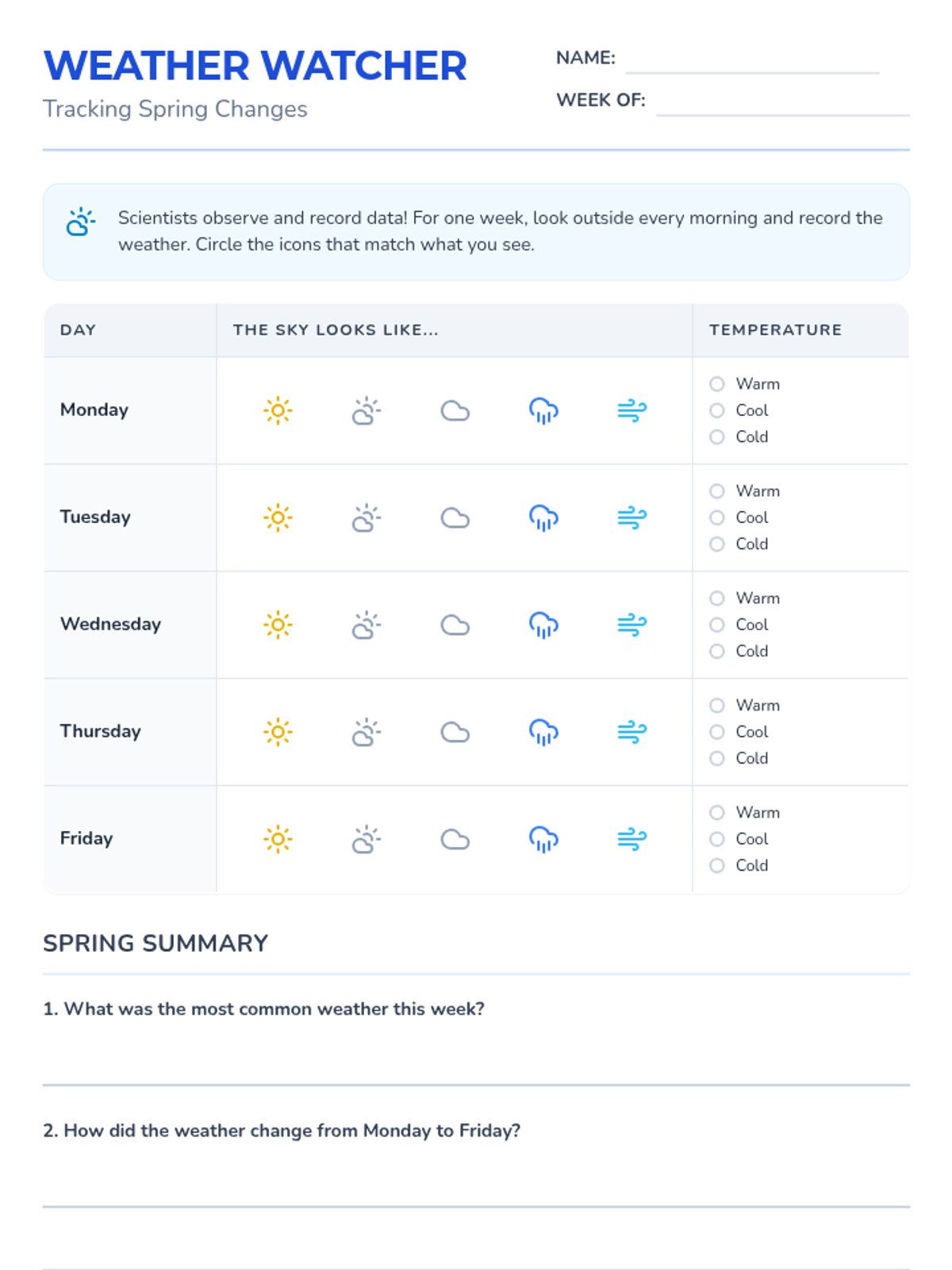 A weekly weather tracking log for students to observe and record daily weather patterns and temperature changes during spring.