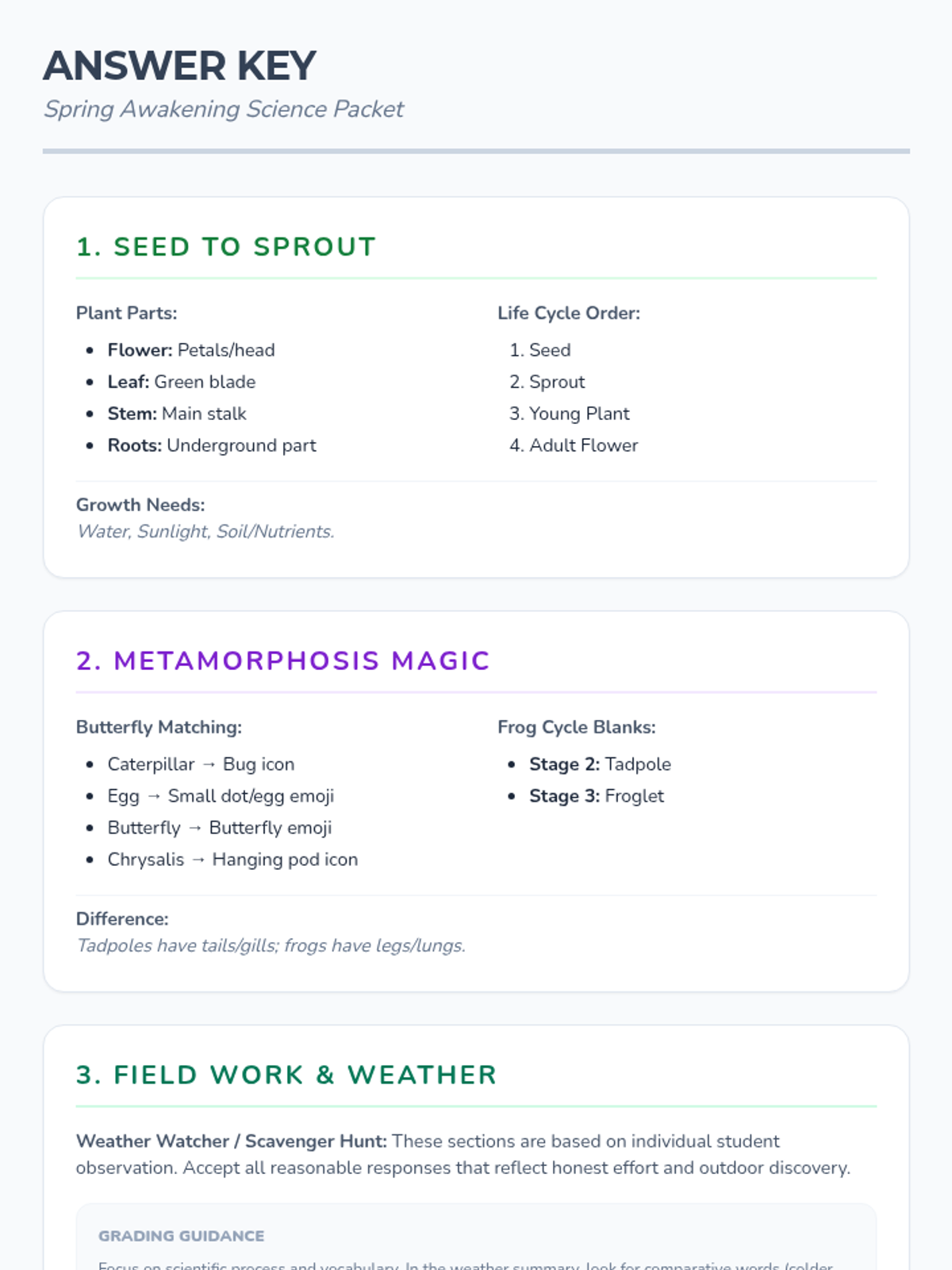 A consolidated answer key for the Spring Awakening worksheet packet, providing correct labels, orders, and example responses.