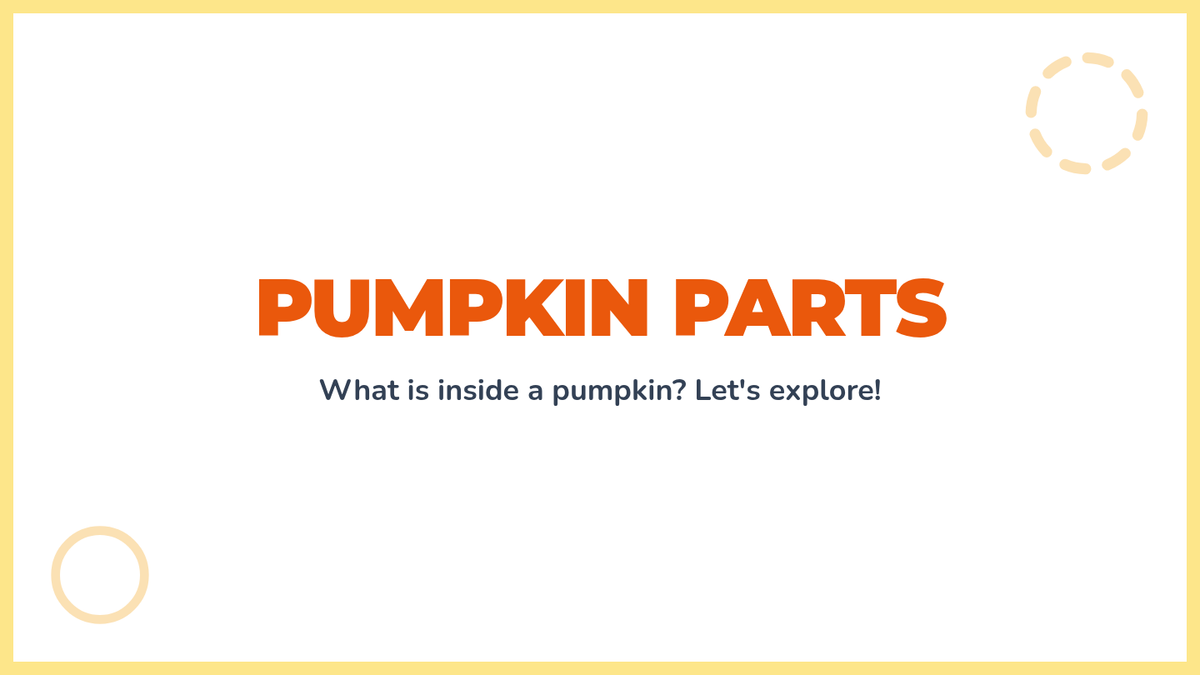 Educational slides about pumpkin anatomy and growth cycles, using large text and simple icons suitable for 2nd-grade level readers.
