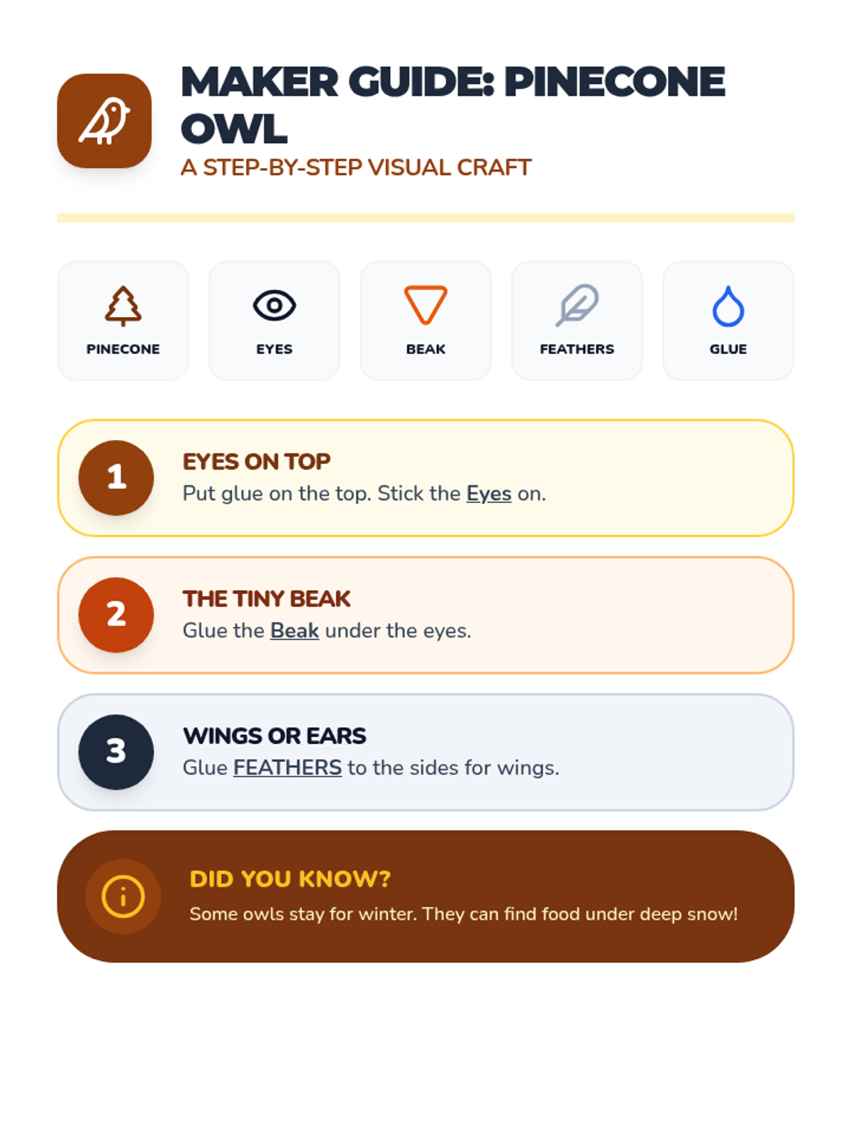 A visual craft guide for making a pinecone owl. Simplified steps and large icons make it accessible for middle school students with lower reading levels.