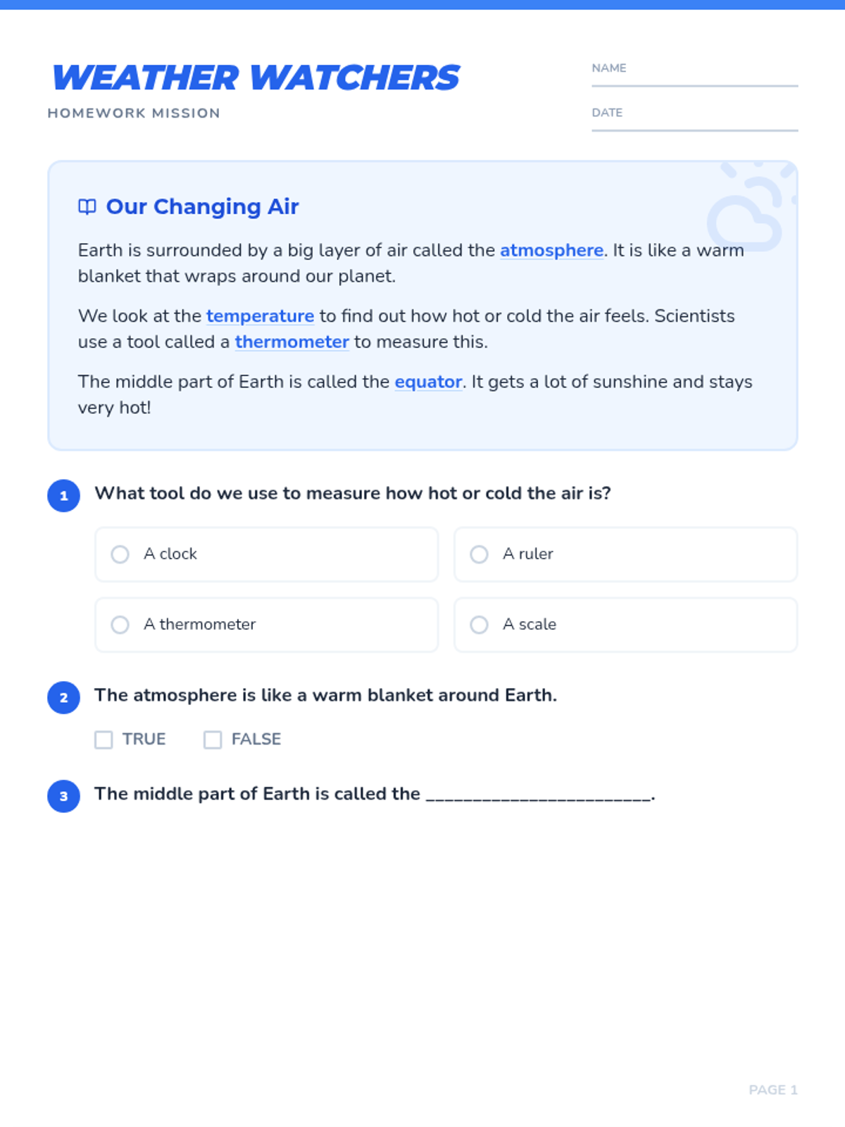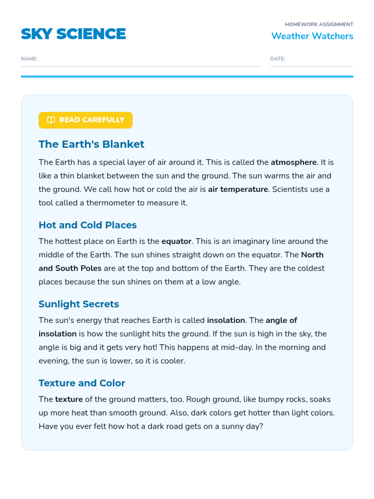 A 2nd-grade homework worksheet on the Earth's atmosphere and air temperature, featuring a simplified reading passage and four engaging questions, including a map-drawing activity. Updated for better page flow.