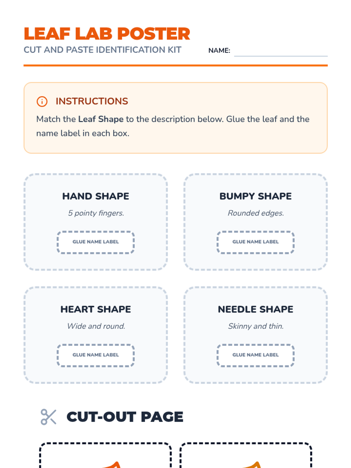 A cut-and-paste poster activity for students to identify different leaf shapes and names. Includes a poster template page and a cutout page with icons and labels.