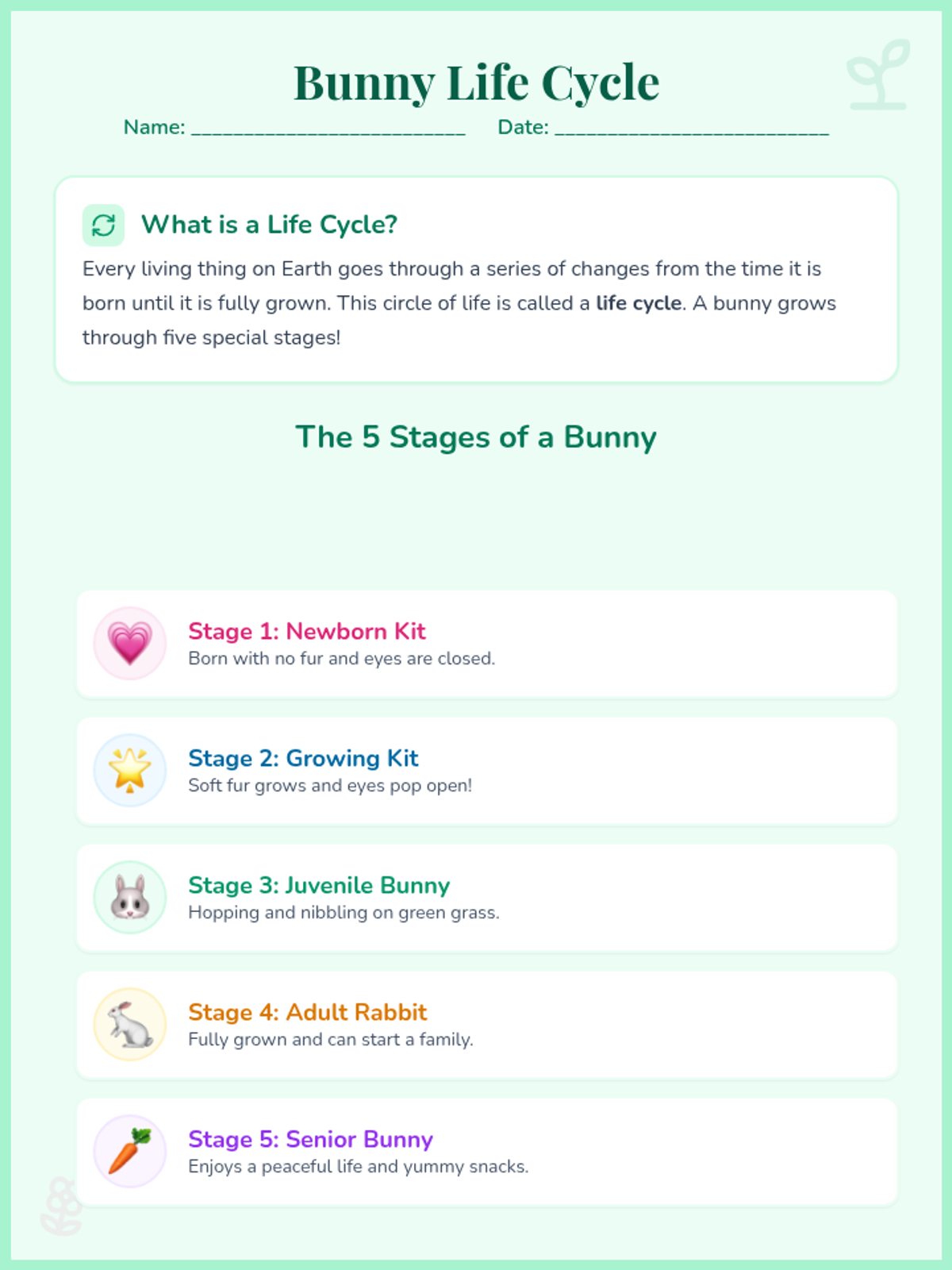 A two-page educational handout for 2nd graders about the life cycle of a bunny. The first page defines a life cycle and visually illustrates the five stages using cute icons, while the second page features a grade-level reading passage explaining each stage in detail.