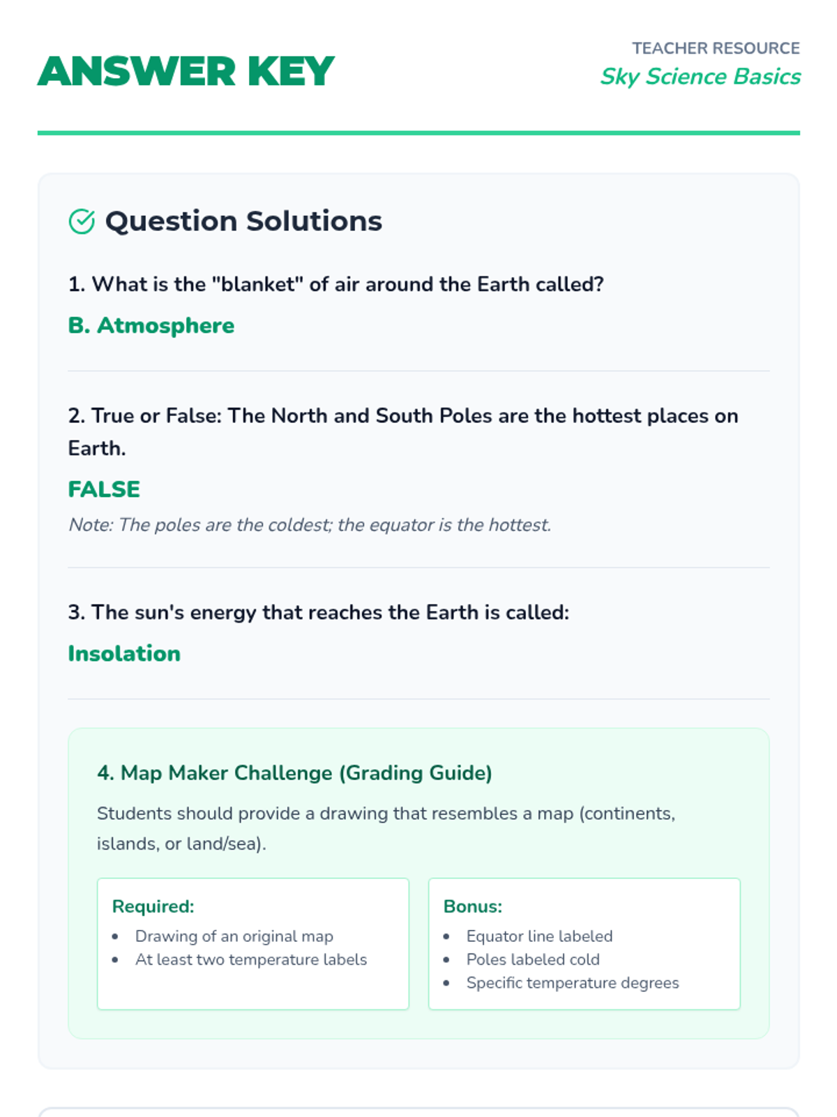 A clear answer key for the Climate Report Worksheet, providing sample responses and grading notes for teachers.
