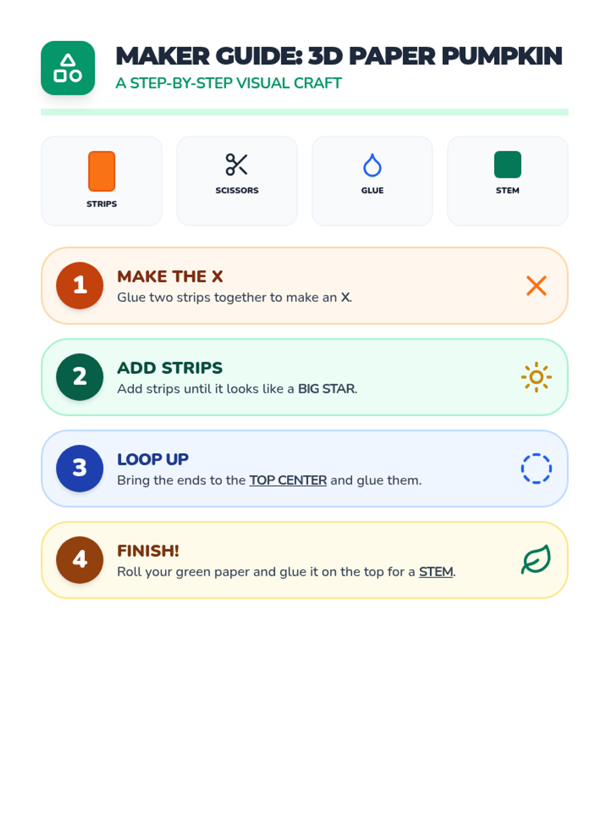 Visual step-by-step guide for creating a 3D paper pumpkin using paper strips. Designed for students at a 2nd-grade reading level with clear icon support.