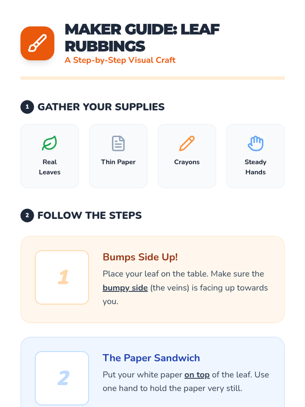 A step-by-step visual craft guide for creating leaf rubbings. Designed with large icons and clear, simple instructions for students at a 2nd-grade reading level.