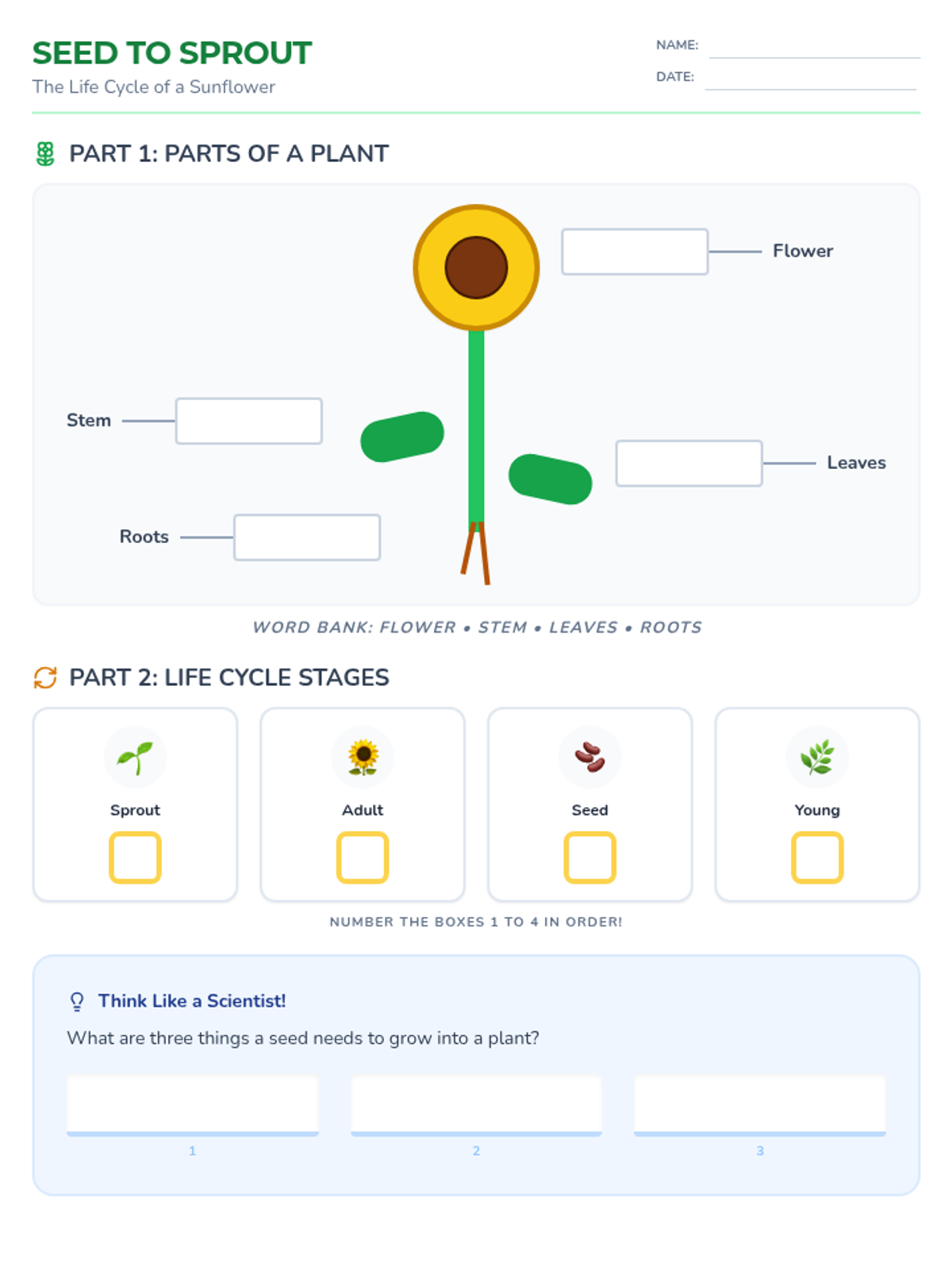 A worksheet for 2nd graders to learn the parts of a plant and the life cycle of a sunflower, including a word bank and a thinking question.