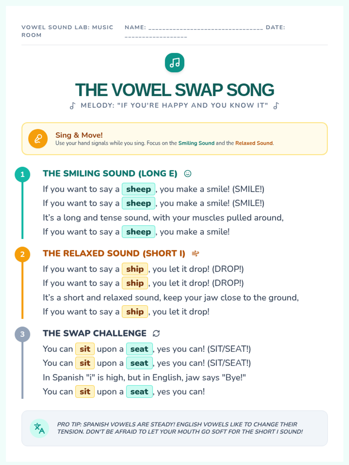 A song sheet set to the melody of "If You're Happy and You Know It," designed to help students practice the physical articulation and phonemic contrast between English short i and long e sounds.