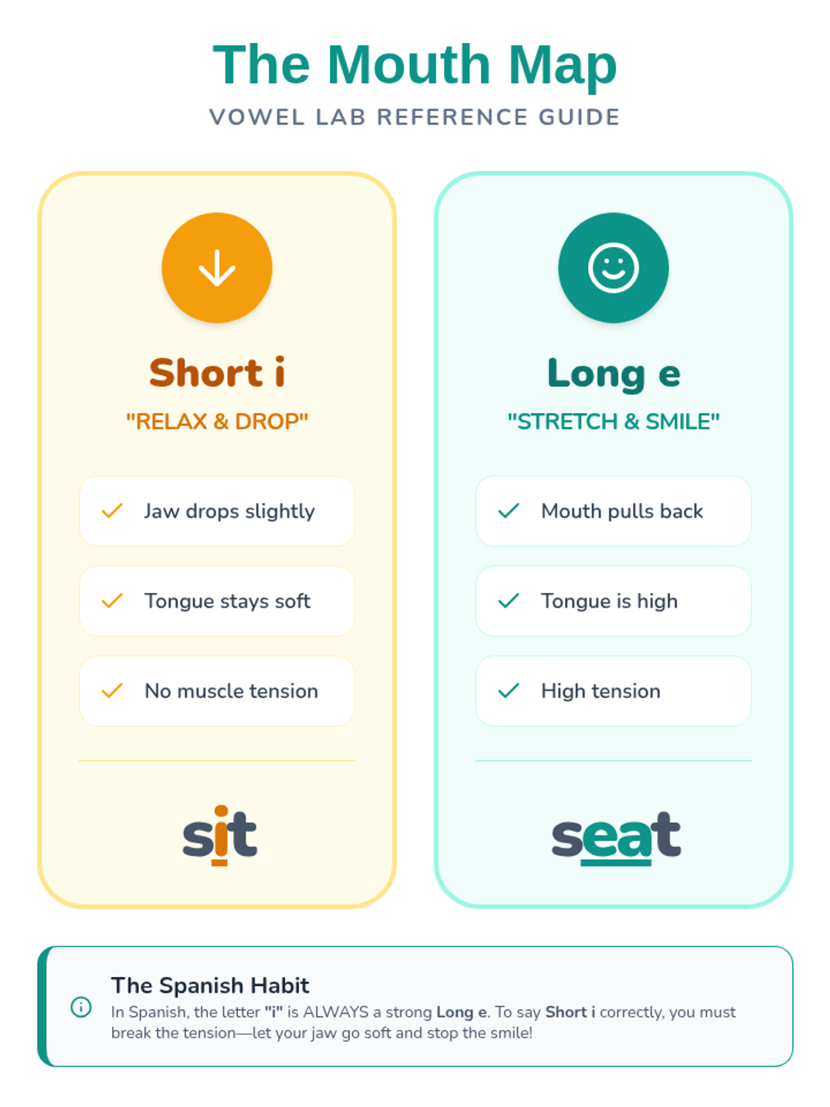 A high-contrast visual reference sheet (Mouth Map) that compares the articulatory features of /i/ and /e/ sounds, highlighting jaw position and muscle tension for ESL students.