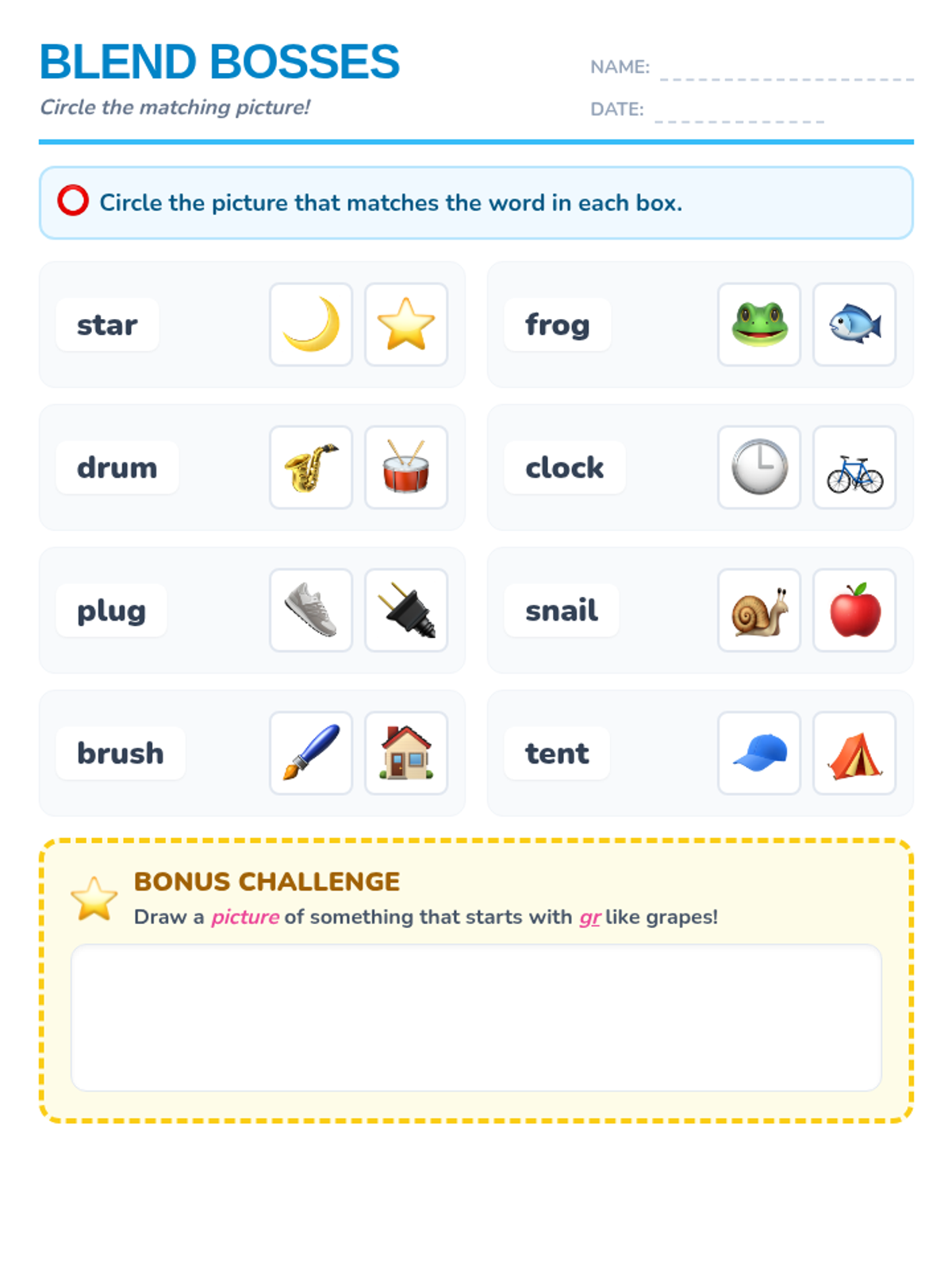 A printable worksheet for kindergarteners to practice consonant blends by matching words to images and completing a creative bonus challenge.