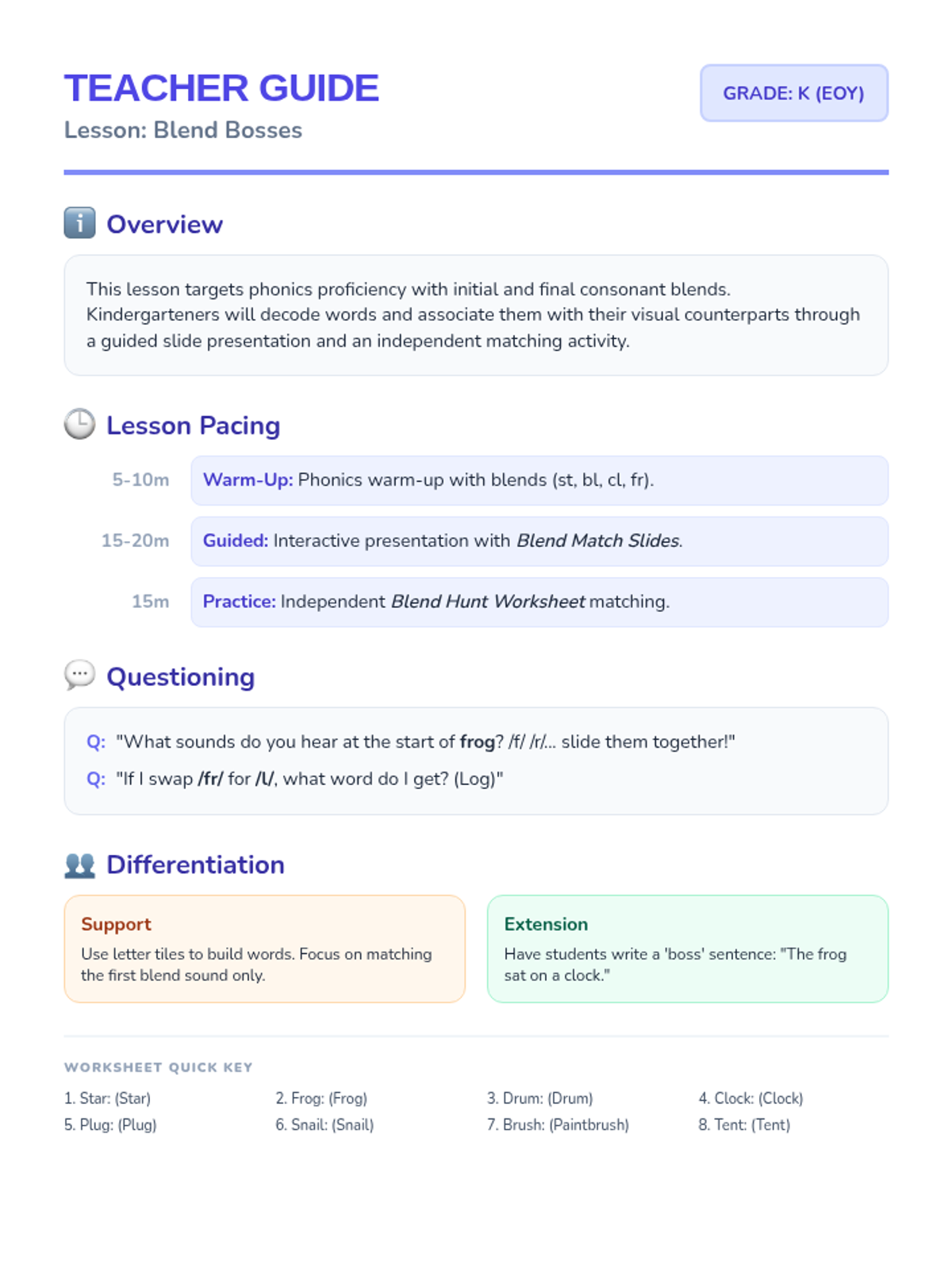 A comprehensive teacher guide for the Blend Bosses lesson, including pacing, discussion prompts, differentiation strategies, and an answer key.