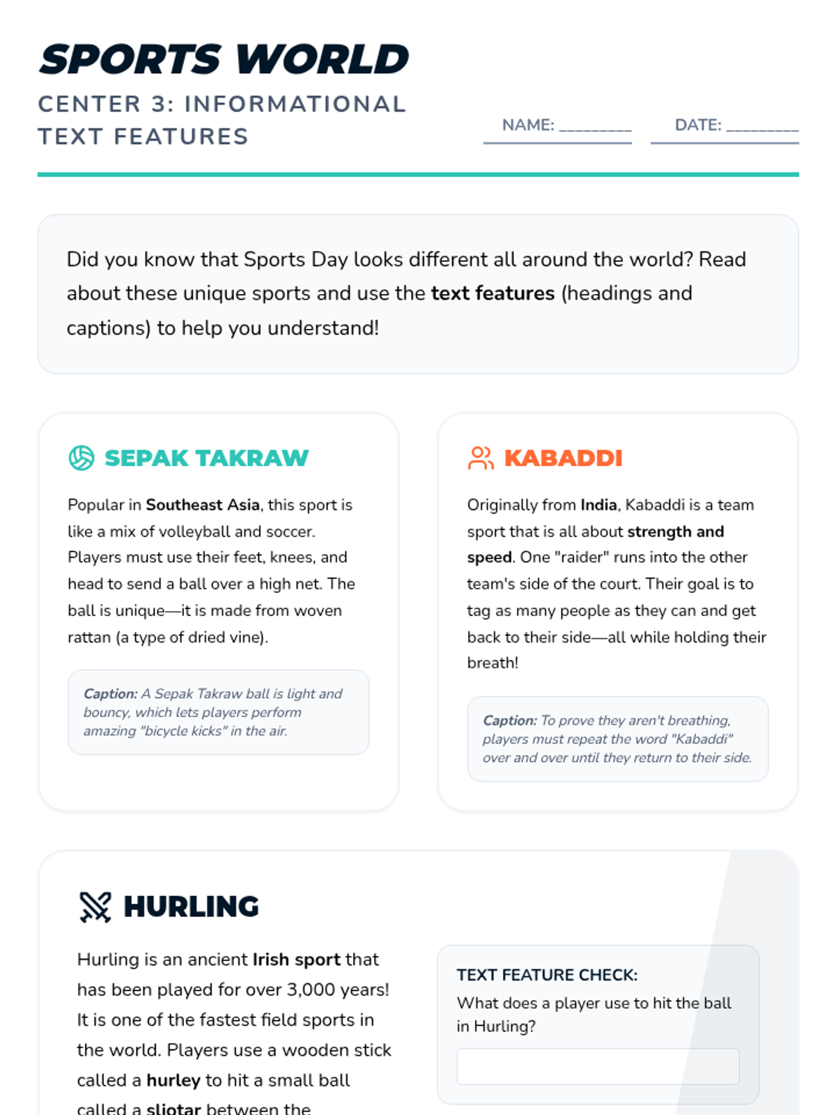An informational reading center activity about unique world sports (Sepak Takraw, Kabaddi, Hurling) focusing on text features and comparisons.