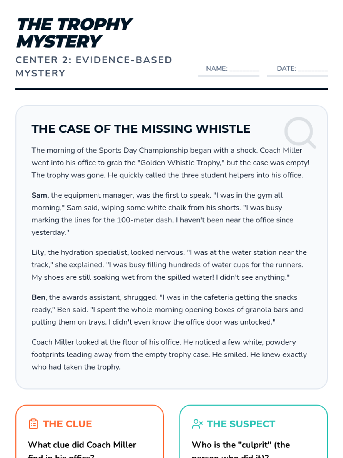 A reading center mystery activity where students use text evidence to solve "The Case of the Missing Whistle." Includes the story, a clue tracker, and a space for evidence-based reasoning.