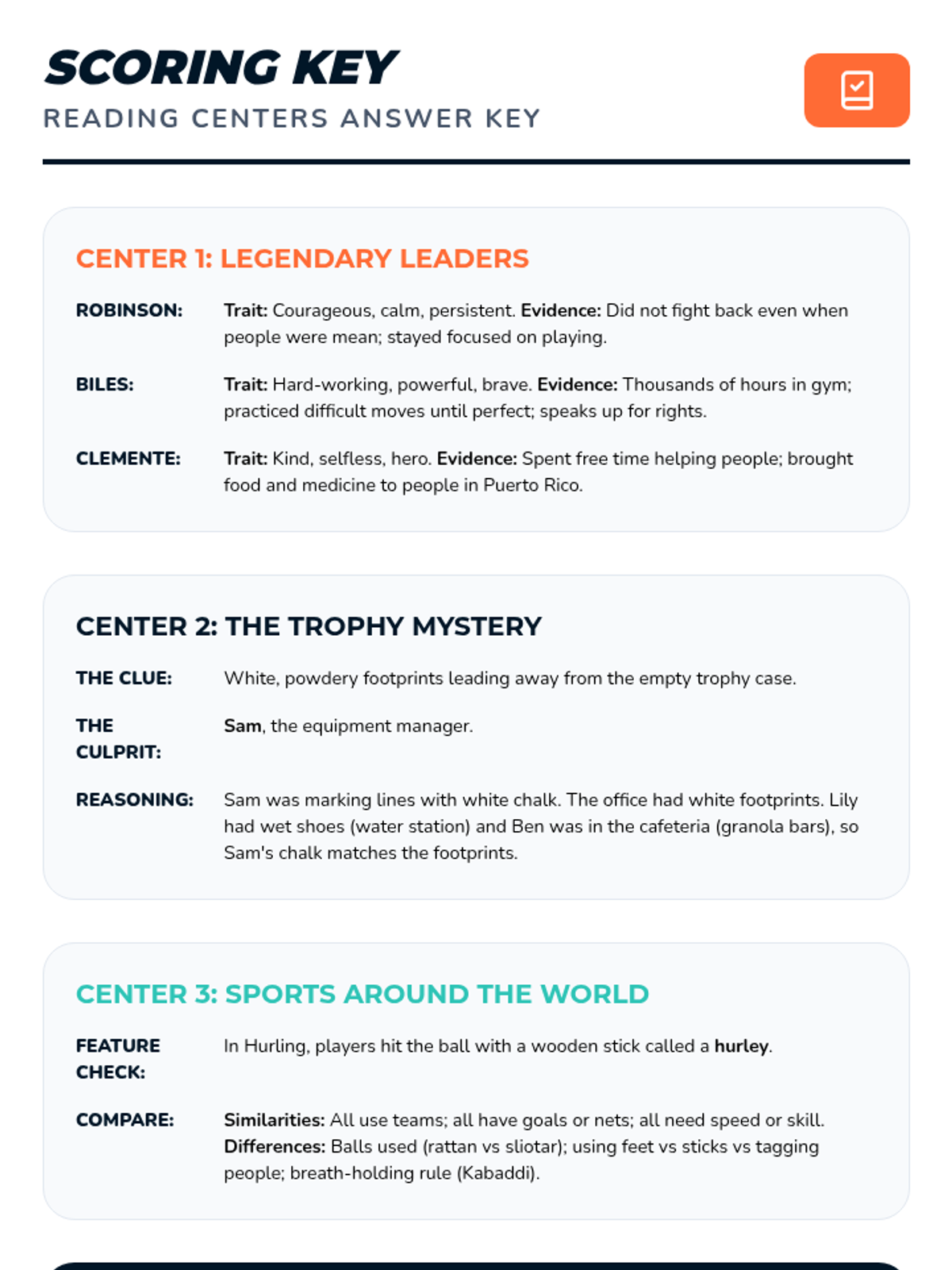 Answer key and teacher guide for the Sports Day reading centers, providing solutions for all three activities: Legendary Leaders, The Great Trophy Mystery, and Sports Around the World.